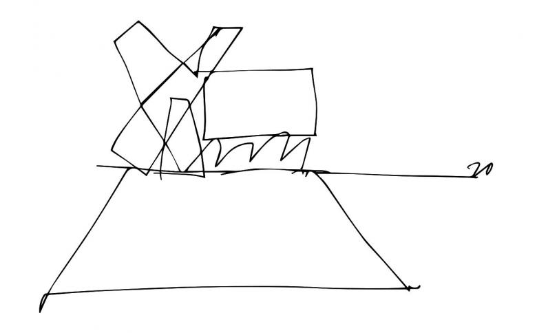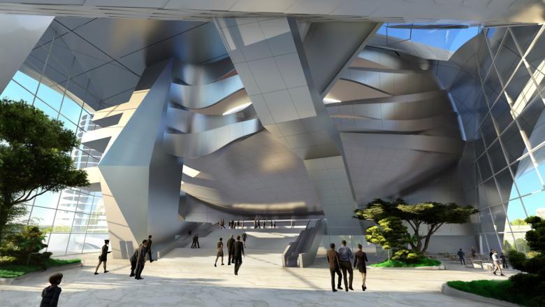The building integrates itself confidently into the surroundings and forms with its four main functions a recognizable ensemble. A graceful, flying Theatre Cloud, two Crystals for the Museum and the Art Centre, embrace the Public 24h Foyer on top of the Plinth.