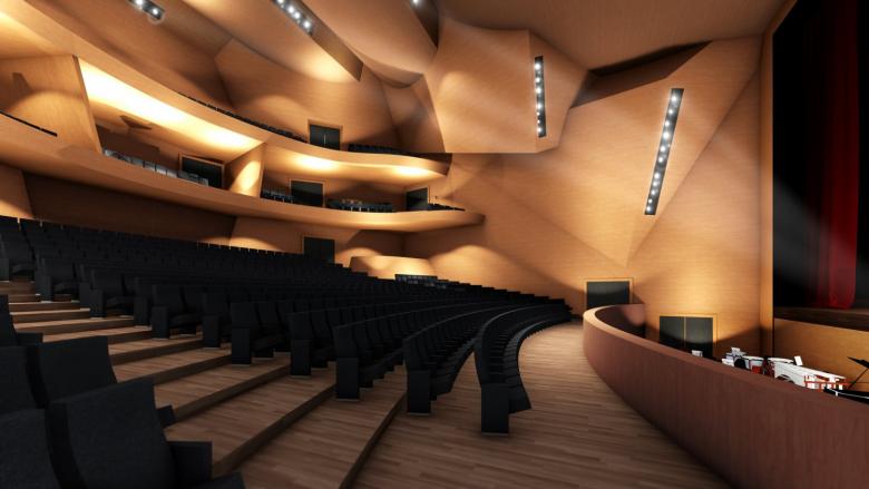 In the center of the building, the heart of the project is located: an auditorium for 950 visitors including a stage tower and back of house areas. The additional functions, such as offices, VIP rooms and rehearsal rooms are arranged in the Cloud.
