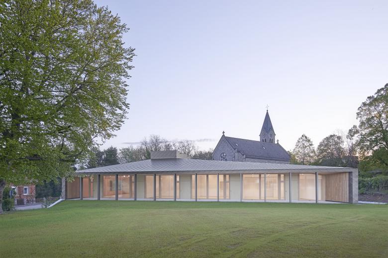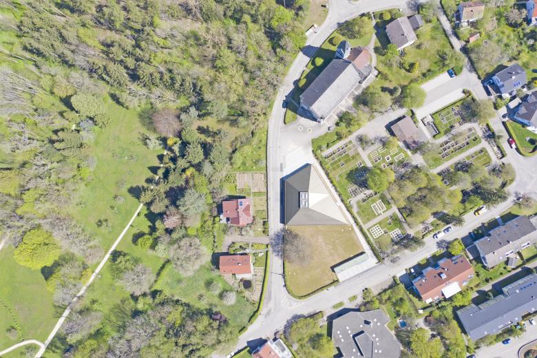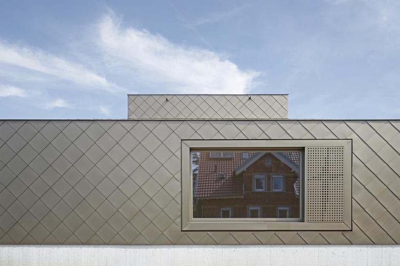 Der polygonale Baukörper des neuen katholischen Gemeindehauses besetzt das sich nach Norden verjüngende Grundstück in seiner vollen Breite. Damit werden klare städtebauliche Zonierungen geschaffen, in dessen Mitte das Gemeindehaus sowohl ordnendes wie auch verbindendes Element ist. Der nördlich des Baukörpers ausgebildete Kirchplatz ist ein repräsentativer Ort, der Raum für kirchliche Veranstaltungen bietet aber auch als Treffpunkt vor und nach dem Kirchgang dient. Das eingeschossige Gebäude ist ein reiner Holzbau, der auf einem Betonsockel sitzt. Die Holzkonstruktion ist vollständig mit einer metallischen Hülle aus eloxierten Alu- Schindeln verkleidet. Das skulpturale Erscheinungsbild wird sowohl Außen wie Innen zusätzlich durch ein zentral positioniertes Oberlicht, das Foyer, Saal und Nebenraumflur belichtet, gestärkt. Die überdachten Außenbereiche beim Haupteingang im Norden sowie die wettergeschützte Vorzone im Süden sind mit Holzlatten aus Weißtanne verkleidet. Dieses Thema setzt sich im Foyer und im Saal fort. Hier sind die Decken mit Weißtannelatten verkleidet und die Wände mit furnierten Holztafeln.