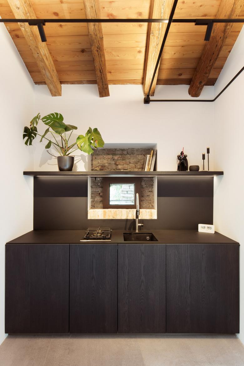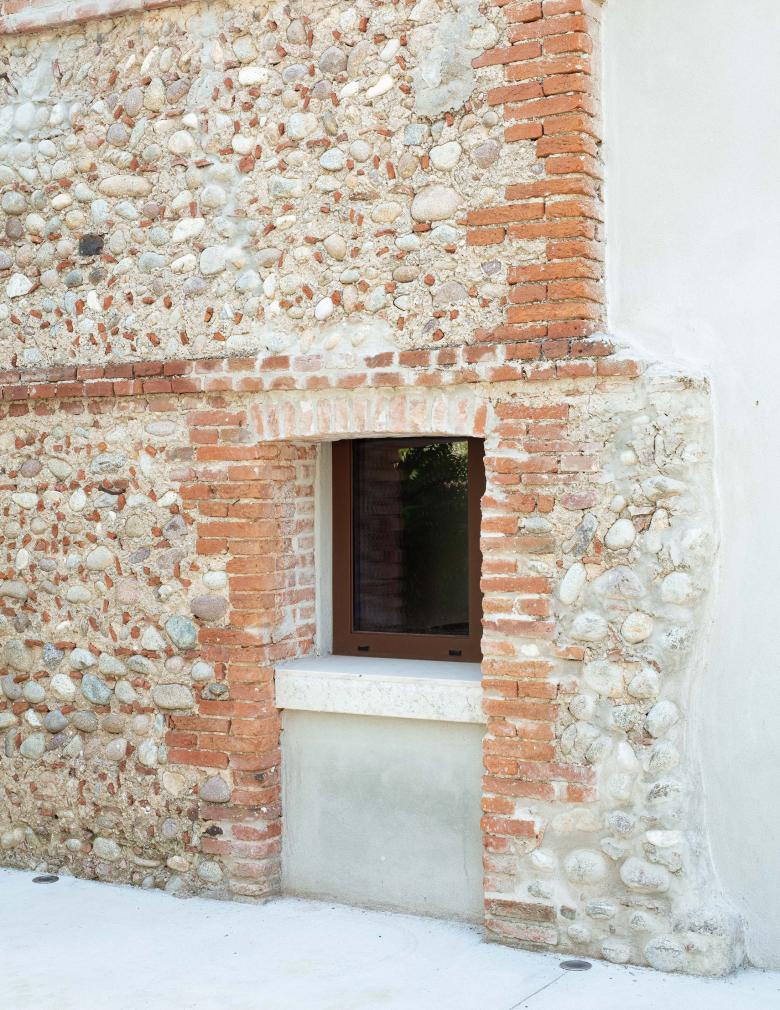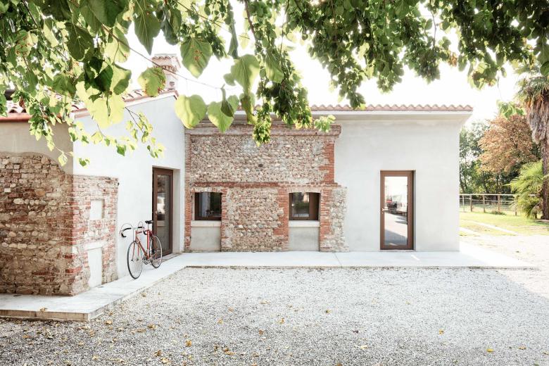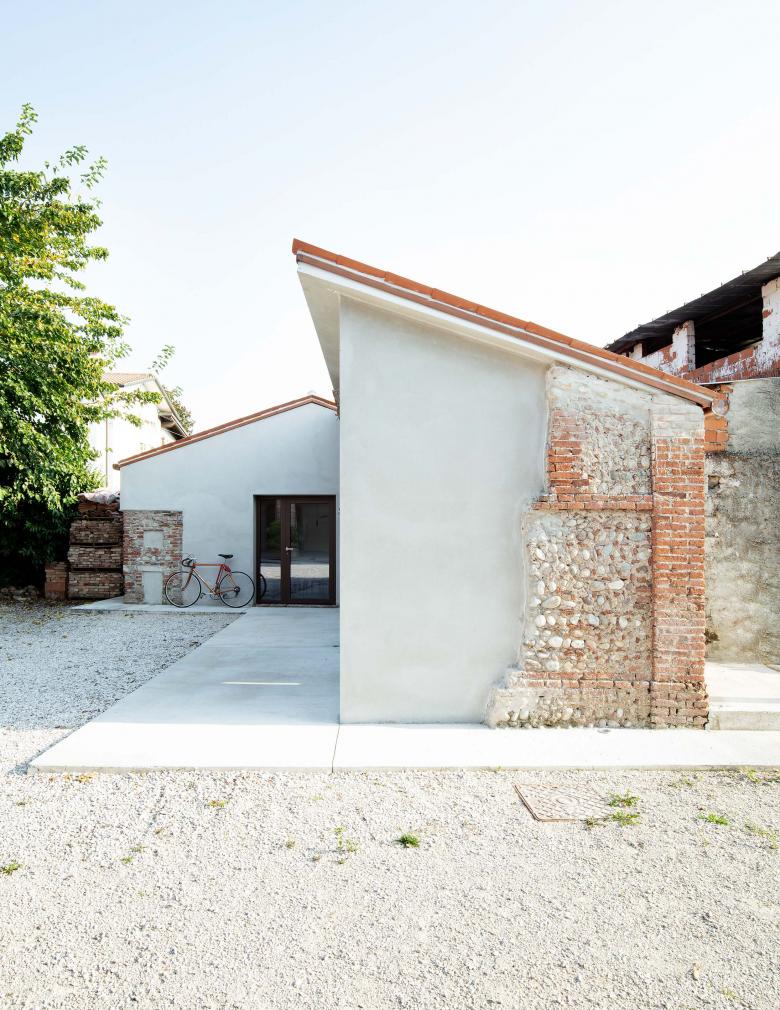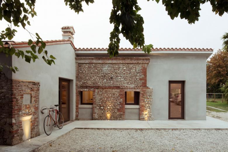 Progetto di restauro di un piccolo annesso dei primi anni del '900 facente parte di un complesso rurale veneto. L’approccio progettuale è stato quello di ricomporre il volume originario dell’edificio, dichiarando le porzioni di muro di nuova costruzione rispetto a quelle esistenti che portano impresso il passaggio del tempo. Le addizioni sono in laterizio intonacato di colore grigio neutro, per far risaltare al meglio le porzioni originali in laterizio e sasso. La sagoma così ottenuta risulta essere quella dell’edificio originario senza creare un falso storico. La copertura è fatta con travi in legno recuperati e restaurati. All’interni sono stati ricavati degli spazi accessori allo studio, come la cucina e i servizi annessi. La cucina è di colore scuro con ante il rovere vulcano, finitura ripresa sul piano del tavolo.