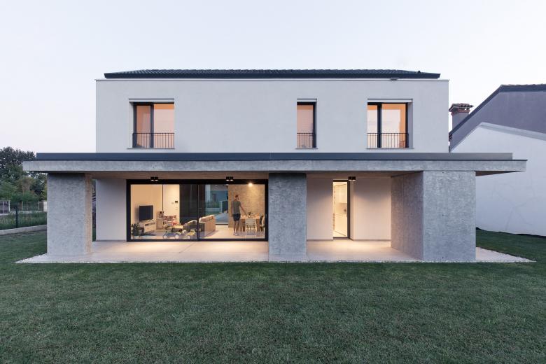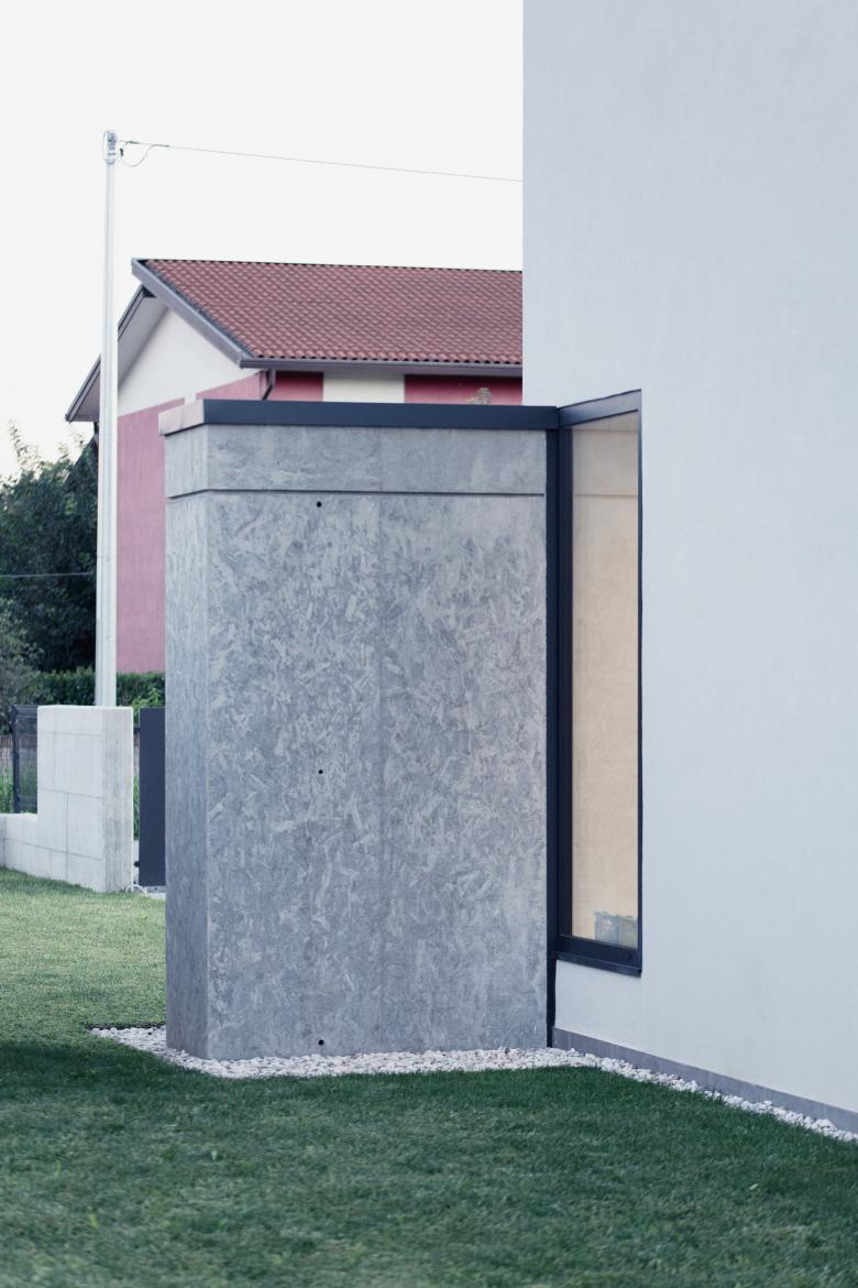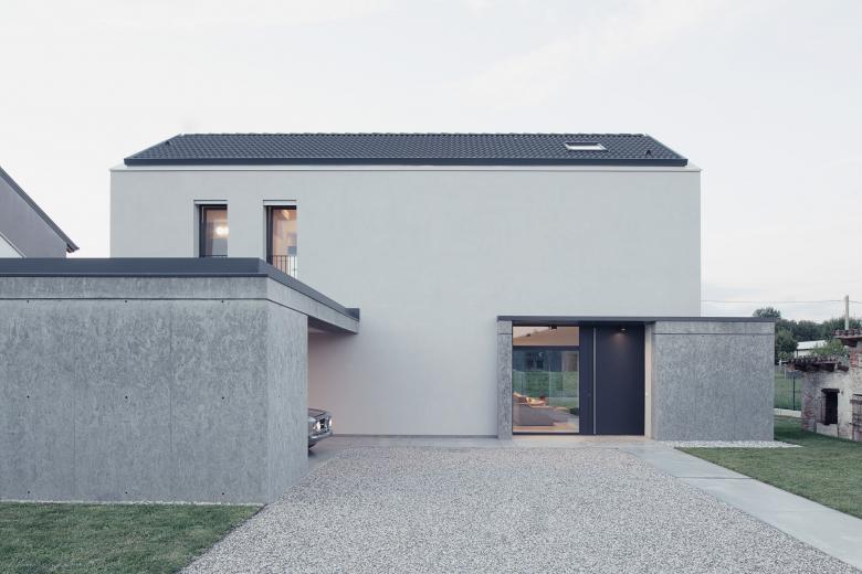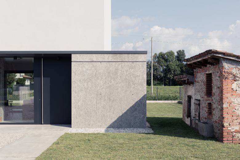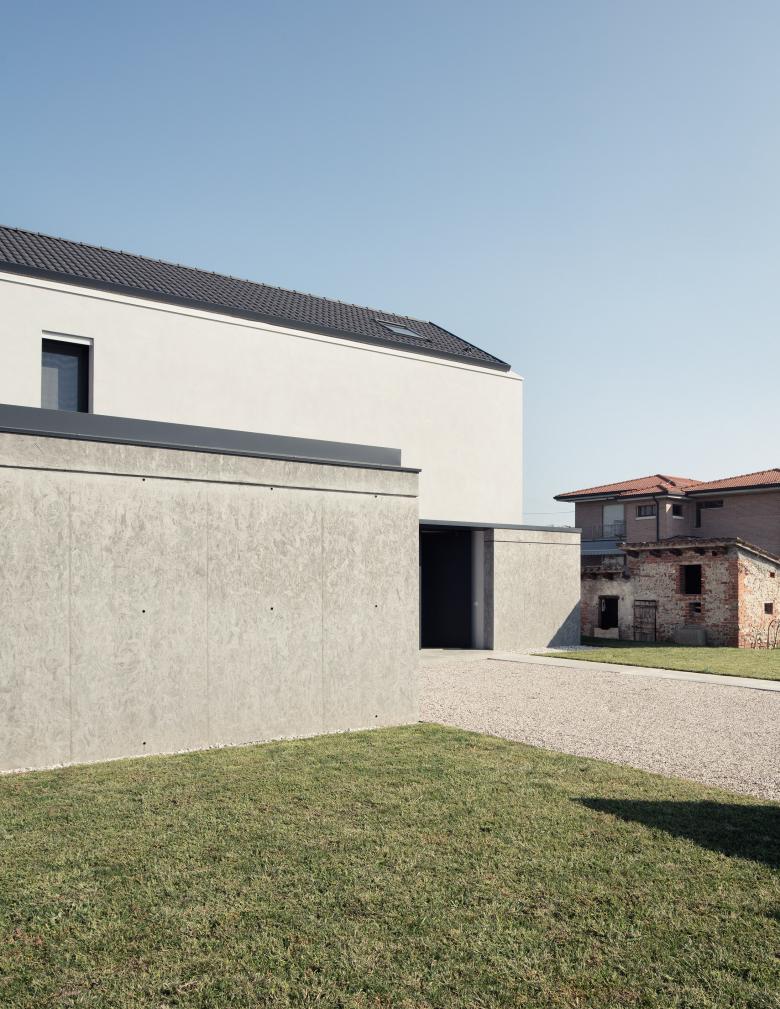 Casa singola in campagna per una giovane coppia. Il progetto nasce dall’ idea di un volume puro, che segue l’archetipo della casa monolitica. Viene parzialmente demolita l’abitazione degli anni 60 mantenendo due corpi in calcestruzzo e pietra. Il nuovo fabbricato è integrato con il contesto allineandosi ai fabbricati circostanti e mantenendo intatta l’esistente gerarchia volumetrica attraverso una disposizione spaziale interna funzionale.Particolare attenzione è stata riposta nello studio della reinterpretazione del tetto a due falde. Il corpo di fabbrica principale, dove viene archetipizzata al massimo l’idea di casa, viene cinto da una grande soletta sorretta da elementi semplici, entrambi in cemento armato gettato in opera su casseri di legno osb.All’interno gli spazi sono di dimensioni contenete e ottimizzati per ospitare la giovane famiglia che vi abita.