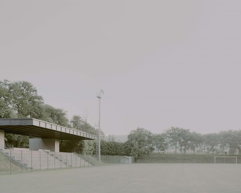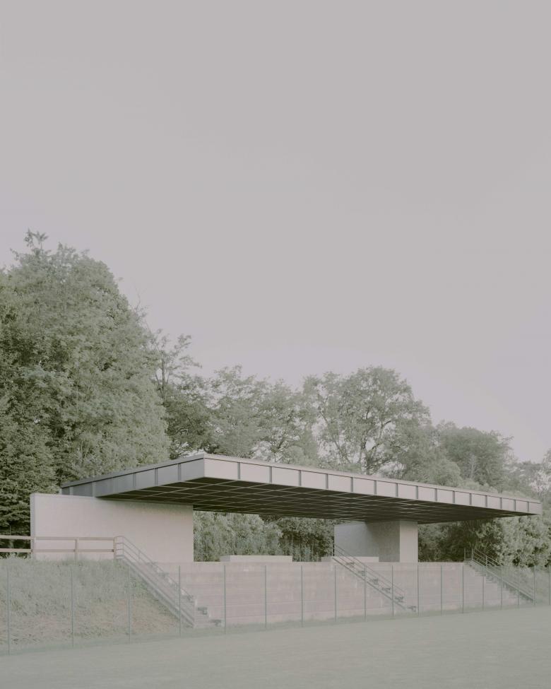 Le tribune, attualmente poste su un declivio del terreno, sono collocate lungo il lato lungo del campo da calcio. La nuova copertura si conforma come un’unica piastra, composta da travi metalliche, giuntate tra loro a formare un “cassettonato” sospeso tra cielo e terra, sorretto solamente da due setti in cemento ortogonali tra loro, orientati in modo da accogliere gli spettatori e indirizzare al loro vista sul campo.