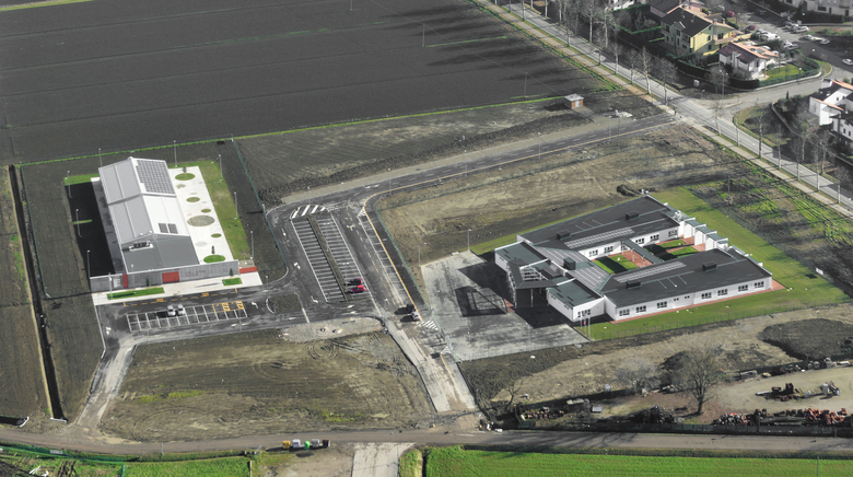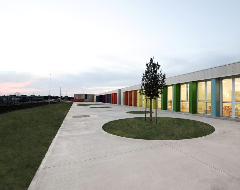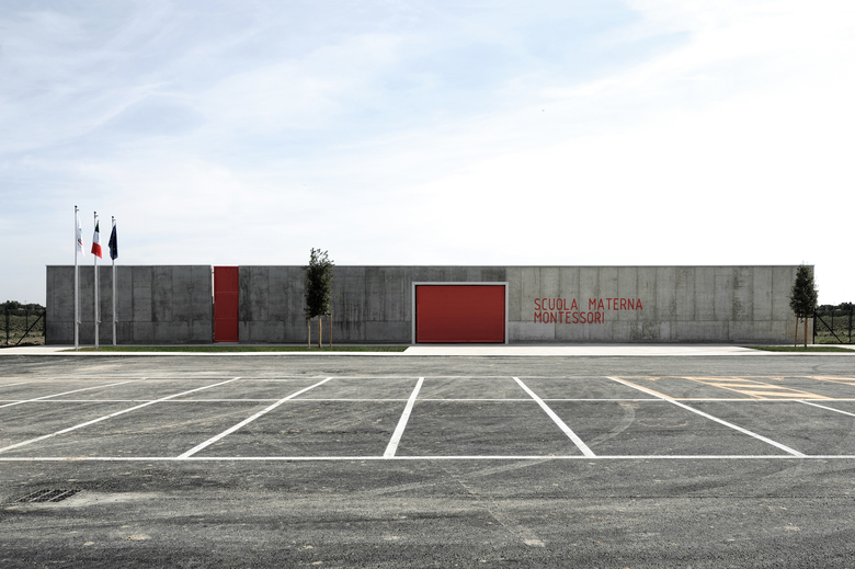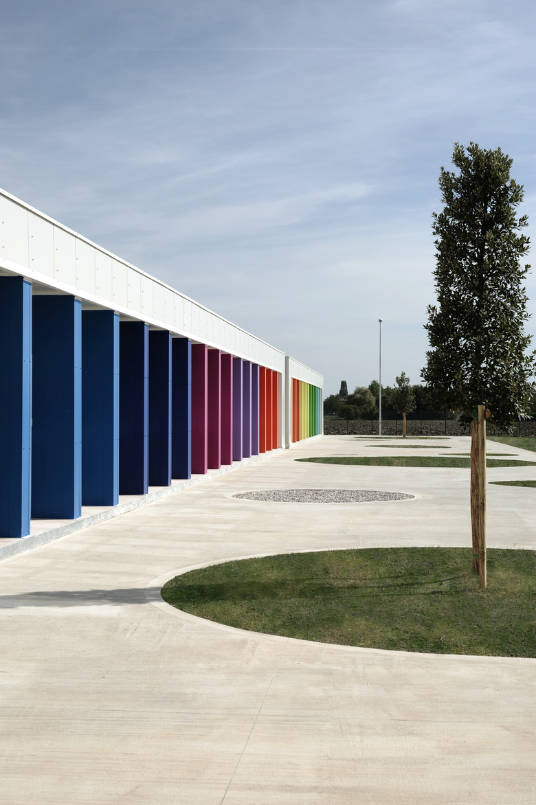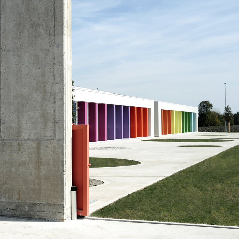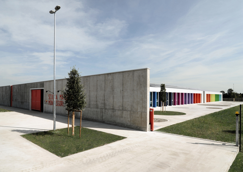 Edifico scolastico realizzato in 50 giorni per l’emergenza del terremoto in Emilia Romagna. L’asilo + nido Montessori è caratterizzata da una serie di portali colorati per creare un ambiente confortevole per l’educazione dei bambini. Progetto in collaborazione con Mide Architetti