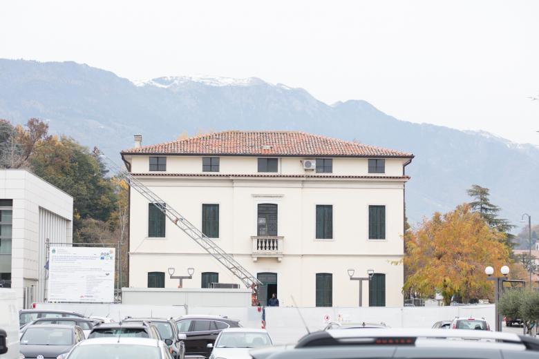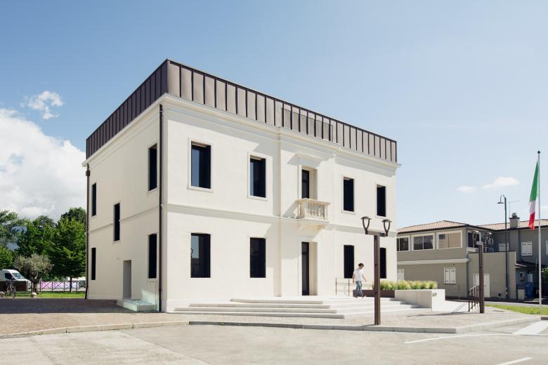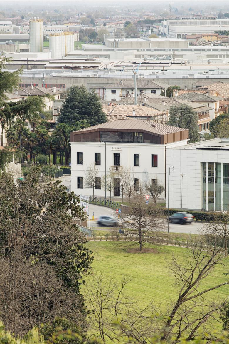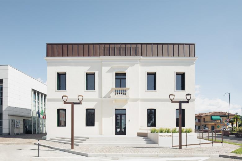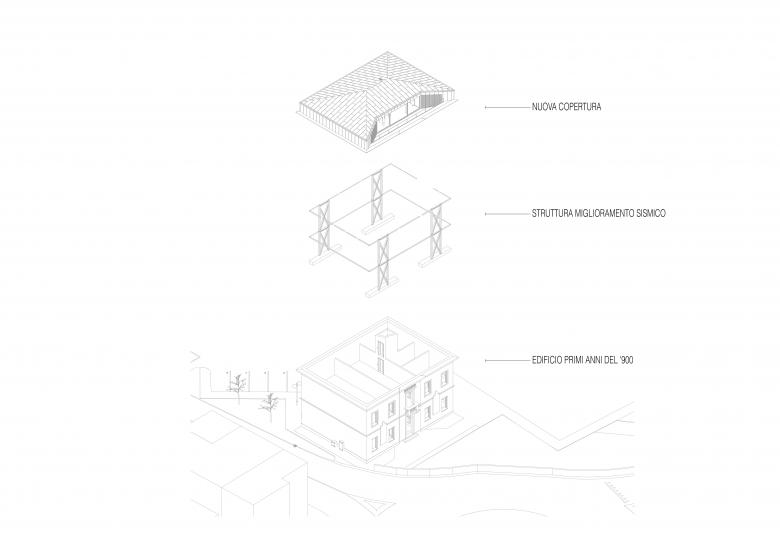Il progetto propone un’architettura chiara ed essenziale, che esalta le qualita? spaziali dell’edificio. Il solaio e la copertura del secondo livello in calcestruzzo (ampliamento eseguito negli anni ’60) verranno demoliti, ricostruiti e riconfigurati con una struttura piu? leggera in acciaio: il volume sommitale riproposto sara? rivestito in lamiera aggraffata tinta brunita, per innescare un dialogo tra la contemporaneita? e la preesistenza. Viene proposta una terrazza ricavata scavando il volume del secondo livello e della copertura, un belvedere che inquadra il paesaggio del Monte Grappa e la magnifica Villa Piovene. Questo spazio puo? diventare uno dei luoghi cardine del territorio, un vero spazio di qualita? per i cittadini. Il sistema delle forometrie sul prospetto ovest, viene riequilibrato per recuperare una composizione piu? ordinata e simile all’originale. Per quanto riguarda le finiture interne si prevede l’uso di materiali legati alla tradizione (pietra di Vicenza al piano primo e legno all’ultimo piano per le pavimentazioni interne) e reinterpretati secondo canoni contemporanei (rivestimento esterno del volume secondo piano/copertura e infissi in lamiera aggraffata preverniciata con finitura brunita.