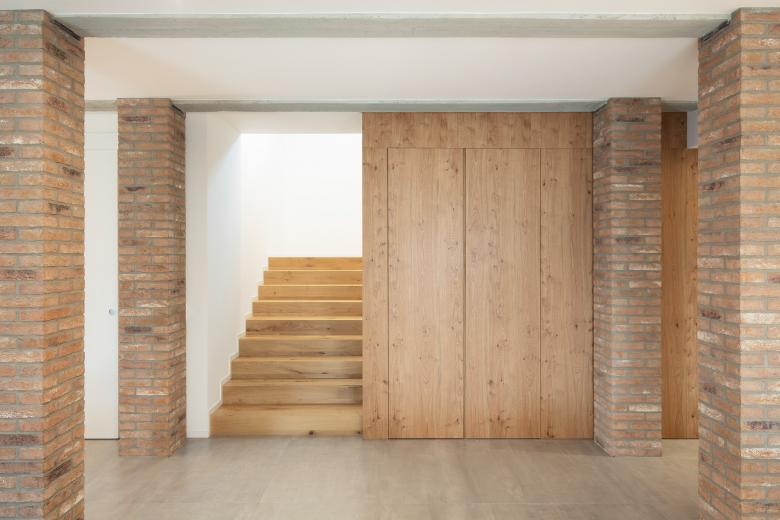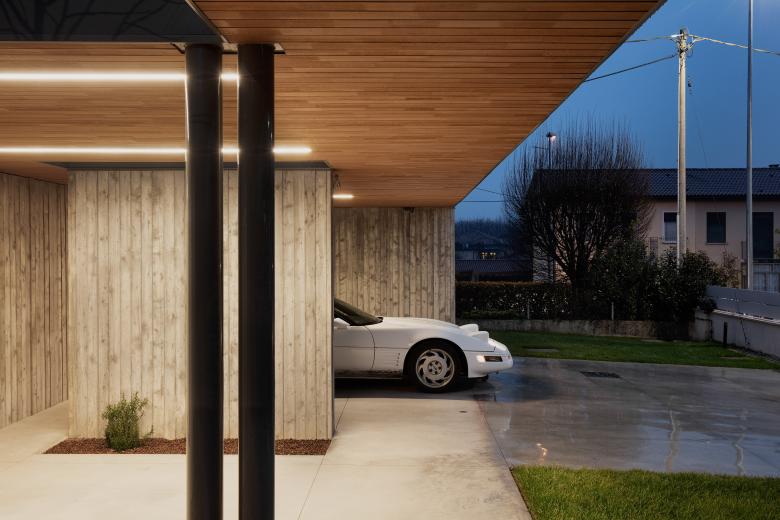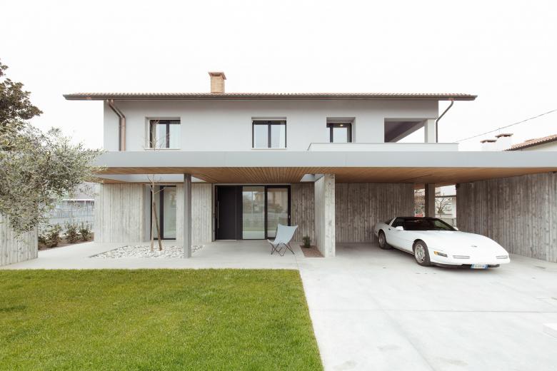 Progetto di Restyling di un abitazione costruita a fine anni 70 nel comune di Nove (VI). L’intervento è stato mirato nel distribuire una nuova zona giorno e di servizio a piano terra, e la riorganizzazione della zona notte a piano primo. L’appartamento che prima era tutto collocato su un piano, ora si sviluppa su una casa a due piani fuori terra. Il collegamento è stato reso possibile con l’innesto di un nuovo vano scala in calcestruzzo, materiale che viene ripreso per la struttura portante della nuova pensilina metallica esterna. La nuova copertura è forata per lasciar passare un albero che diventa parte dell’architettura.