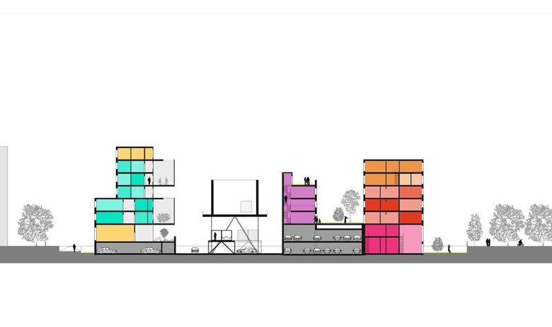 An der Strasse ist der teilgewerbliche Studio-Typus vorgesehen, zum Park der