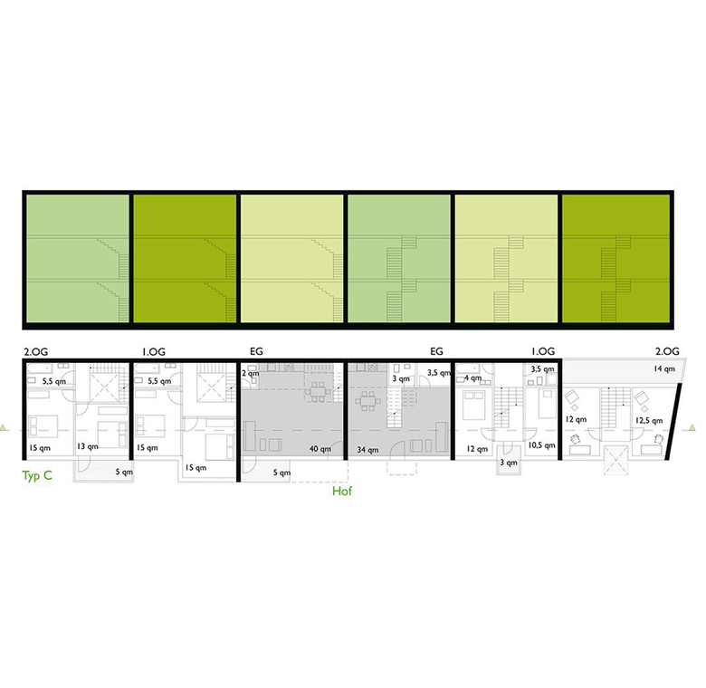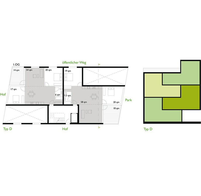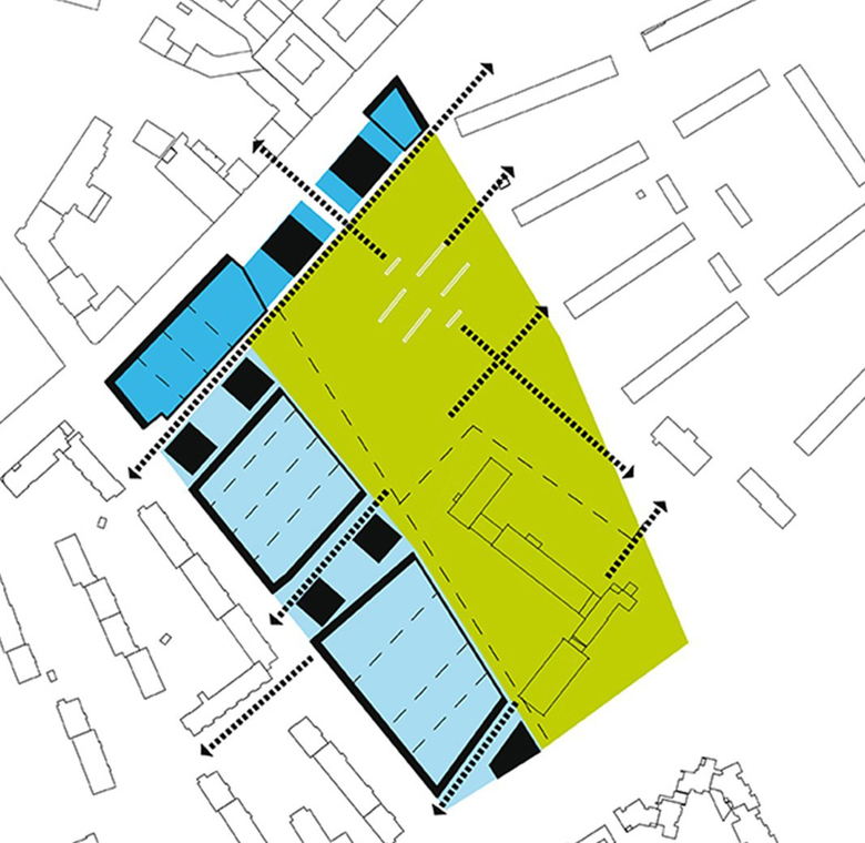 Die Struktur der Bebauung folgt den weitgehend beibehaltenen historischen Parzellengrenzen. Der homogene Blockrand mit innerstädtischen Adressen fasst Wohnhöfe, die mit bewährten Bautypen eine übersichtliche Nachbarschaft erzeugen. Zum Park kontrastiert Durchlässigkeit den Blockrand und macht diesen zu einem selbstbewussten Bindeglied im Stadtraum.