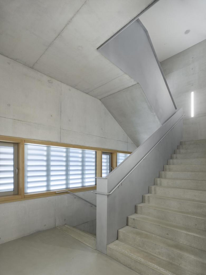 Hinter dem bestehenden 1912 von Richard Dollinger erbauten Schulgebäude des Zeppelin- Gymnasiums entsteht auf dem Schulhof ein dreigeschossiger Neubau mit Mensa, Klassentrakt und Arbeitsräumen als Erweiterung des bestehenden Schulbaus. Das Gebäude befindet sich zwischen Hauptgebäude, Sporthalle und der benachbarten Entsorgungsunternehmen der Stadt Stuttgart und fügt sich maßstäblich in den Baumbestand ein. Der Neubau zeigt sich als klarer, länglicher Baukörper, der sich sowohl mit seinem symmetrischen Aufbau, als auch durch Materialität und Farbigkeit auf das historistische Schulgebäude bezieht.