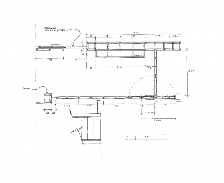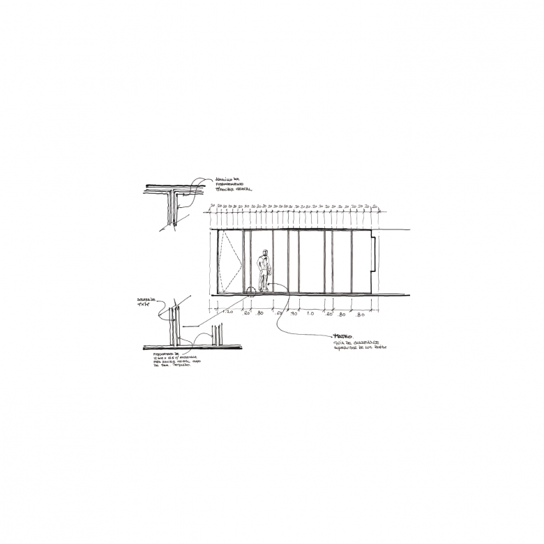 La experiencia que promueve la serenidad creativa inicia desde el puente de ingreso, un pasillo de 15 metros de largo, suspendido entre muros de concreto, rudamente terminados, que tienen como remate la puerta de la galería. El patio, al final del pasillo, funciona como un reloj de sol que marca el inicio del verano por medio de la Luz que se filtra hacia el vestíbulo de la triple altura y que coincide con la ranura de la puerta de ingreso los días 21 de junio. La secuencia continúa a través de una galería de arte que vestibula el ingreso a través de la exhibición de piezas que nos remiten a los orígenes de las formas y los espacios, los colores y las texturas. Este es el umbral que nos invita a la reflexión y que nos prepara para el proceso creativo al que estaremos sujetos durante nuestra estancia.