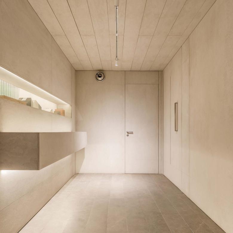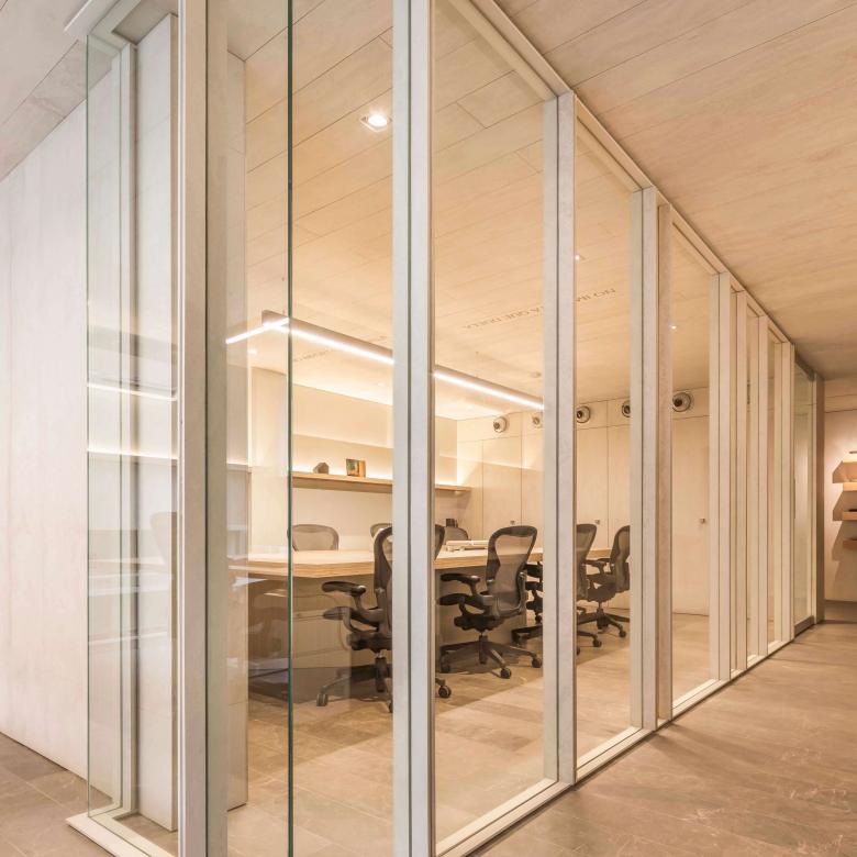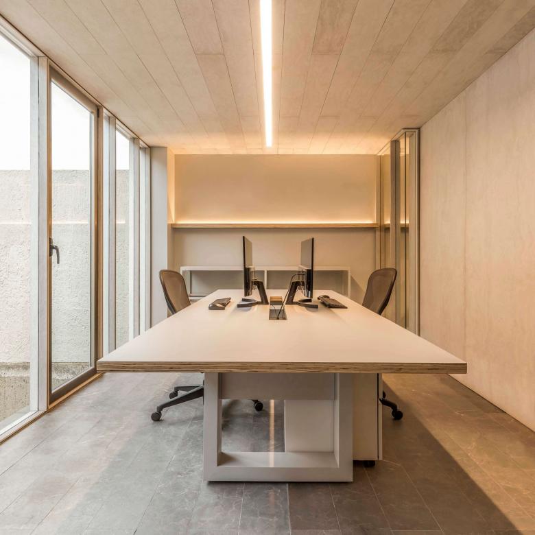 El centro del estudio es la sala de juntas; un lugar monocromático, entre muros y cristales, entre duelas de piedra y de fibrocemento, que moduladas con precisión inmejorable, nos harán sentir envueltos en una atmósfera relajada y armónica, donde cada parte, por pequeña que sea, está entretejida con el todo.