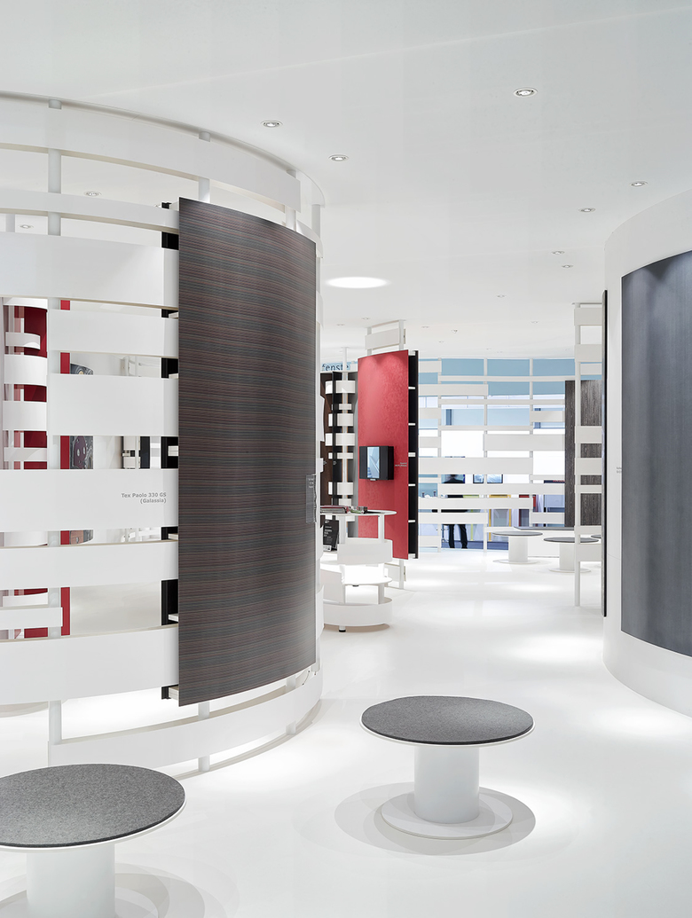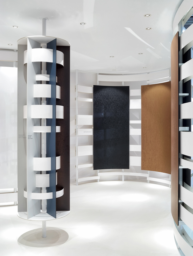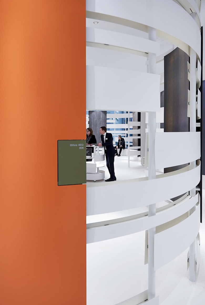 Die neuste Produktpalette in Originalgrösse und geschwungener Form zeigte die Vielfalt der architektonischen Möglichkeiten auf anschaulichste Weise und zog damit die Aufmerksamkeit auf sich. Die Präsentation setzte das HPL-Oberflächenmaterial ins Zentrum und das Trägermaterial in den Hintergrund. Der Stand war mit den Materialien gebaut, die an der Swissbau präsentiert wurden – so erhielt jedes Exponat eine einzigartig realistische und unerwartete Wirkung.