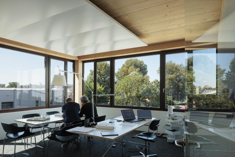 Fassadenbrüstungen in Holzrahmenbauweise mit hinterlüfteten Holzlatten machen die Konstruktion von außen sichtbar. Die beiden Treppenkerne aus Sichtbeton dienen zum Aussteifen des Holzskelettbaus aus Holzstützen und Unterzügen. Ein grundwasserbasiertes CO2- freies Heiz- und Kühlsystem, Dachbegrünung und Photovoltaik helfen, den KfW-40-Standard zu erreichen. Terrassen im Erdgeschoss und eine große Dachterrasse mit Blick auf die Altstadt sorgen für eine angenehme Arbeitsatmosphäre.