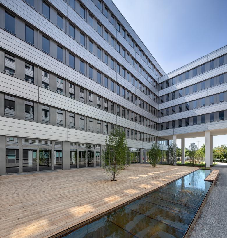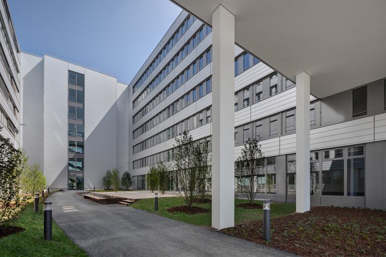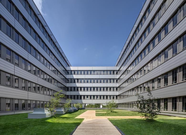 Um die Homogenität des Gesamtbaukörpers zu sichern wird die Materialität, die Proportion der Fassade und Geschossigkeit des Bestandes aufgenommen, ebenso werden die Außenanlagen entsprechend ergänzt. Die Erweiterung bietet Nutzflächen für Büros, Besprechungsräume, Labore und ein Restaurant, dabei sind 1200 zusätzliche Arbeitsplätze vorgesehen.