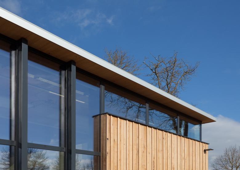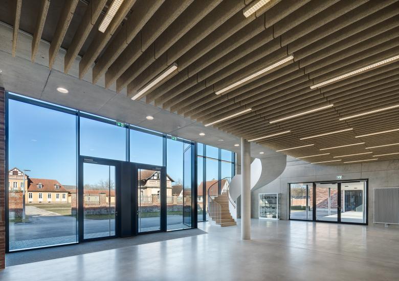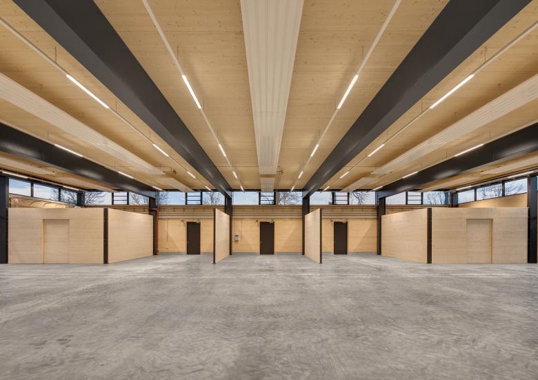 Im Innenraum ist die natürliche Haptik fortgeführt durch unverkleidete Oberflächen, Holzböden, Sichtbetonflächen und mit naturbelassenen Holzdecken. Die Gebäudetechnik nutzt zur Energieversorgung Biomasse aus dem vorhandenen Fernwärmenetz.