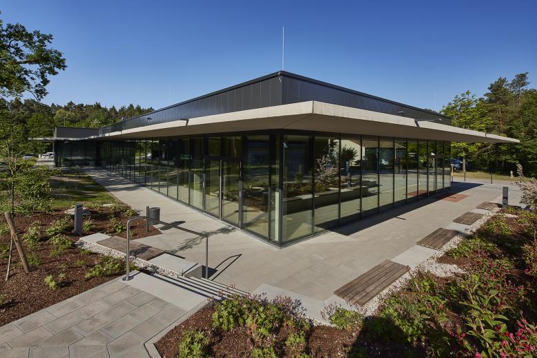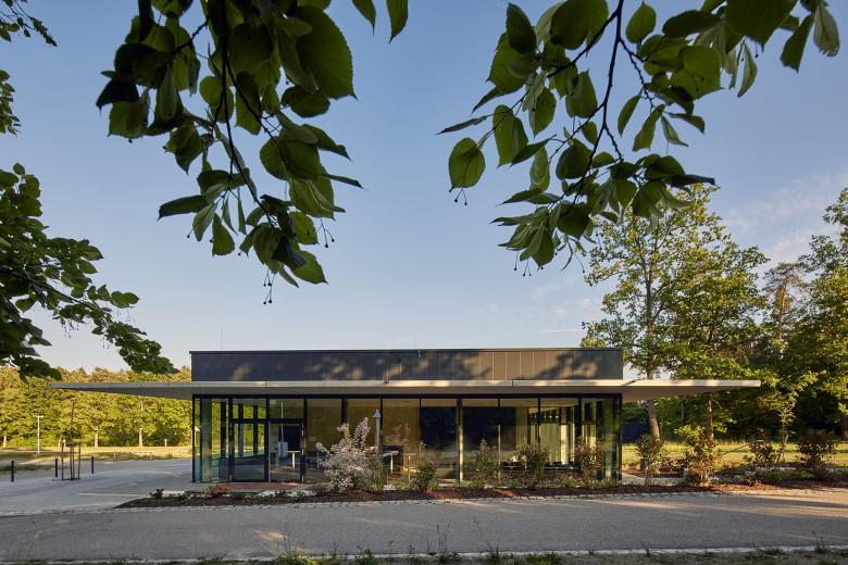 Das Gebäude ist eine Art Pavillon mit einem Flachdach umgeben von Grün inmitten einer Parkanlage.