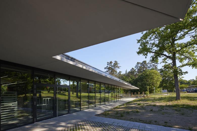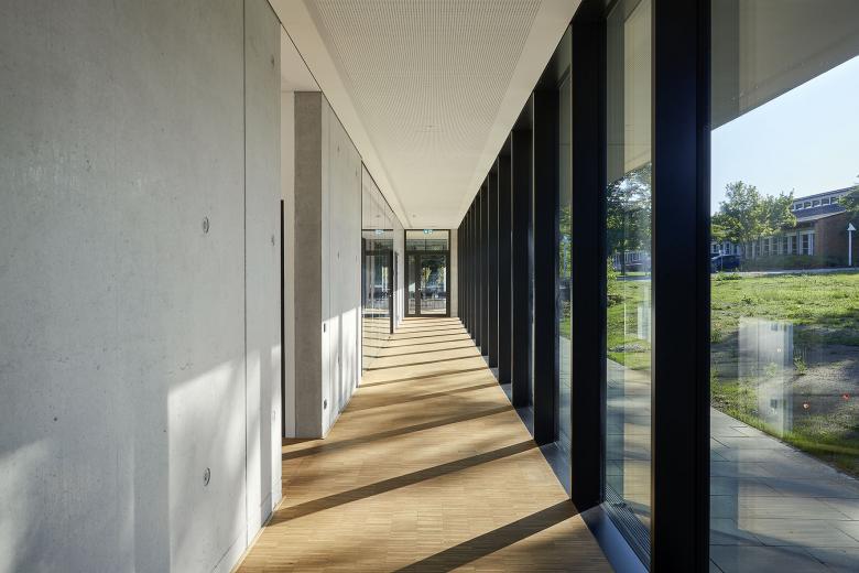 Seine Glasfassade öffnet sich großzügig nach außen. Vertikale Pfosten und mattschwarze Paneele setzen Akzente. Das umlaufende auskragende Betondach dient als Sonnenschutz, ein außenliegender mechanischer Sonnenschutz ist somit nicht notwendig. In Foyer, Fluren und Medienräumen liegt ein massives Industrieparkett aus Eiche als warme Ergänzung zum Sichtbeton der Wände. Die Böden für die Lehrwerkstätte und Labor sind in Industrieestrich gegossen.
