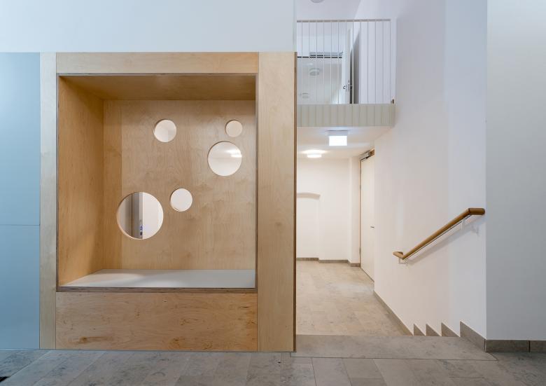 Entscheidend für die Umsetzung der architektonischen Idee ist der richtige Einsatz der Materialität. Wichtig ist hierbei eine Verbindung zwischen dem altehrwürdigen Bestand und den neuzeitlichen Anforderungen von Räumlichkeiten für Kinder zu schaffen. Der Natursteinboden im Erdgeschoss aus Juramarmor und die geölten Holzböden betonen die Harmonie zwischen Alt und Neu in den Aufenthaltsräumen der Kinder.