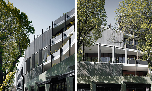 Drawing from the modernist oeuvre such as John Lautner’s Arango House in Acapulco, 401 St Kilda Road is the junction of landscape and architecture. Starting from the bottom, the lower levels are clad in green tiles, reminiscent of Robert Haddon’s decoration found on commercial buildings such as the Napier Hotel in Fitzroy.