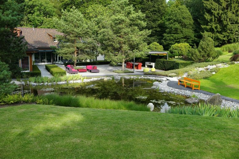 Die grossflächige Gartenanlage und die topographische Lage mit seinen Ebenen und Steigungen in einem Siedlungsbereich im Kanton Appenzell Innerrhoden zeichnen dieses Projekt aus. Eine der grössten Herausforderung bei der Realisierung dieses Gartens war die Einbindung der neuen Gestaltung in die bestehende Landschaft. Als raumbildende und schattenspendende Bäume im Bereich der grossen Holzterrasse wurden deshalb Pinus sylvestris gepflanzt, welche mit ihrer Art die alten bestehenden Föhren wieder aufnehmen. Im Bereich der Lounge bilden Eiben einen niedrigen Rahmen und Gräser geben der Landschaft eine weiche organische Form. Auf diese Art bilden der Garten und das Haus um den mit Seerosen geschmückten Teich eine harmonische Einheit.