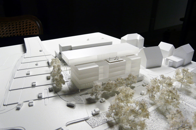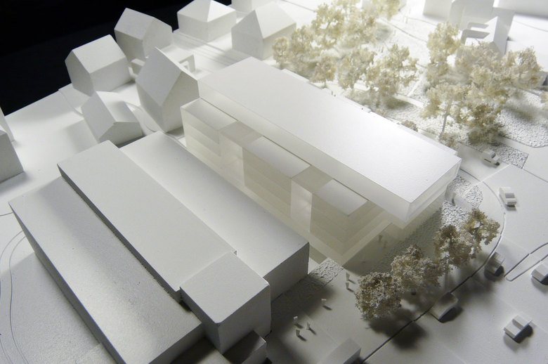 Das Grundstück ist extremen Immissionen ausgesetzt: stark befahrene Straßen mit Lärm- und Staub, ständige visuelle Unruhe des Autoverkehrs, Südausrichtung mit Wärmeinstrahlung, dazu kommt die visuelle Barriere nach Westen durch das Parkhaus. Einzig der Park gegenüber gibt Ruhe und visuellen Ausgleich. Deshalb wird das Gebäude mit seinen vollflächigen Verglasungen von einem filigranen und durchsichtigen Metallgewebe umhüllt. Es entsteht ein geschütztes und ruhiges Binnenklima. An den Lichthöfen wird der Schutzmantel geöffnet und lenkt den Blick auf den Park und auf die historische Stadt. Der Mantel nimmt die Streckmetall-Einhausung des benachbarten Parkhauses auf. Drehbare Lamellen ermöglichen individuelle Variationen der Hülle.