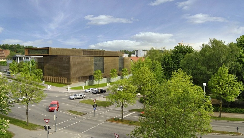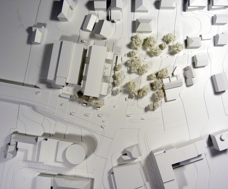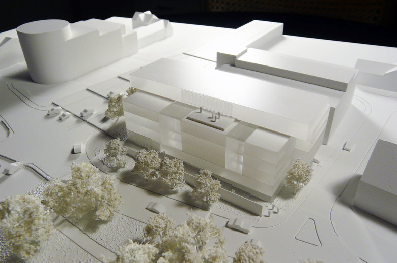 Ausgehend von den in den Skizzen dargestellten städtebaulichen Rahmenbedingungen entsteht ein Gebäude mit einem ‚inneren Städtebau‘: Häuser gruppieren sich um Höfe, Wege und Plätze. Durch Aus- und Einblicke sind sie visuell mit der umgebenden ‚Landschaft‘ verbunden. Die Konstruktion ist dabei denkbar einfach: Geschossflächen als einfache Stahlbetondecken, das Tragwerk als Skelett aus Stahlbetonstützen und aussteifenden Kernen, eine Glashülle umschließt die ‚ganze Stadt‘, der Mantel aus Metallgewebe schützt vor störenden Einflüssen und reguliert die visuelle Beziehung zur Umgebung. Wie in einer Stadt entsteht Raum für Kommunikation und Information: ein geschützter, aktiver Raum.