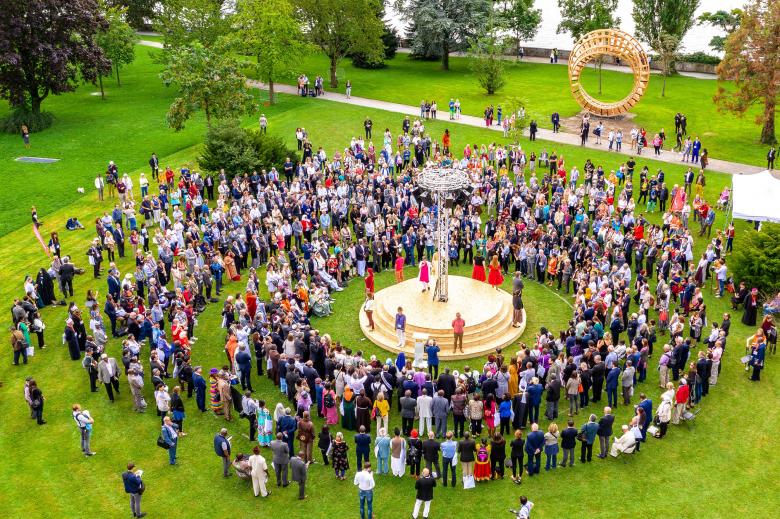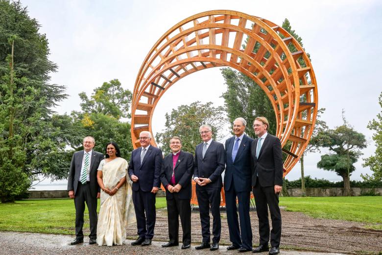 Anlässlich der Eröffnung der Weltversammlung wurde die Skulptur im Beisein von Bundespräsident Frank-Walter Steinmeier der Öffentlichkeit vorgestellt. Am 21. August 2019 fand auf der Insel im Luitpold-Park am Ring für den Frieden eine multireligiöse und spirituelle Zeremonie mit allen Delegierten und vielen Gästen statt. Von hier aus wurde ein Gruß des Friedens aus jeder Religion in die ganze Welt geschickt.