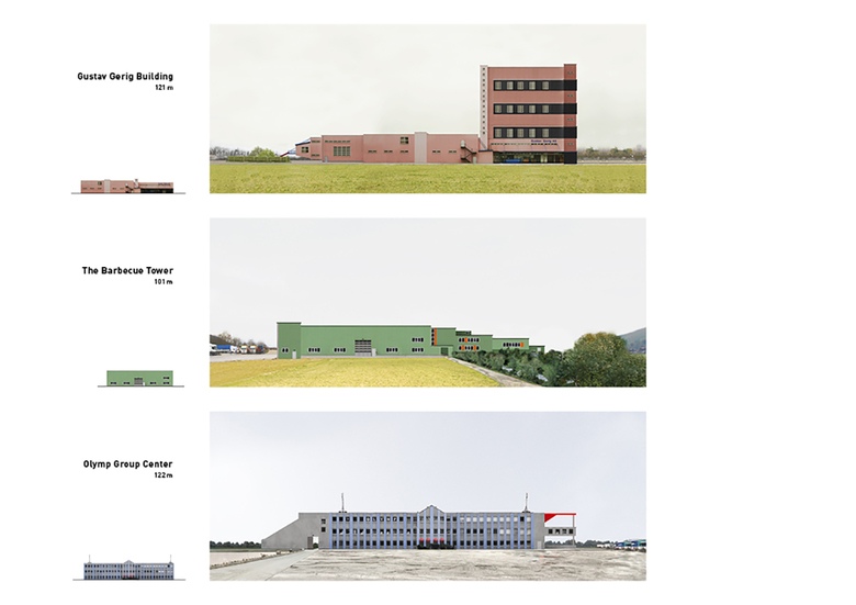The image of highways lined with massive logistics warehouses is characteristic of the Swiss Mittelland—and the town Egerkingen is no exception. These extremely long, horizontal façades create a strong association with the high, vertical facades of American high-rise buildings. Like the skyscraper of Manhattan, the prostrate box of Egerkingen breaks with the conventions of symbolism for monuments. As a 21st century manifestation of Koolhaas’ Automonument, the logistics warehouse does not represent an abstract ideal or an institution of particular importance; it is not an articulation of social hierarchy. The logistics box, through its sheer volume, is simply a symbol for itself. While both the skyscraper and warehouse are primarily economic phenomena, the tower has an applied architectural order that produces distinction between one and the next. This project intervenes to add a ‘base’ and ‘crown’ to each of Egerkingen’s warehouses, thereby giving each building a characteristic expression and a singular relationship to its context. The added housing and working spaces bring new protagonists to the area, which is now dominated by trucks and cars. As only the leftover spaces are occupied with new interventions, the logistics world can continue to operate as before. Just on the peak of the buildings, the fall of the monument has left its marks. The asphalt pavement is broken and a bit of green space is given back to the functional world of the logistics halls.