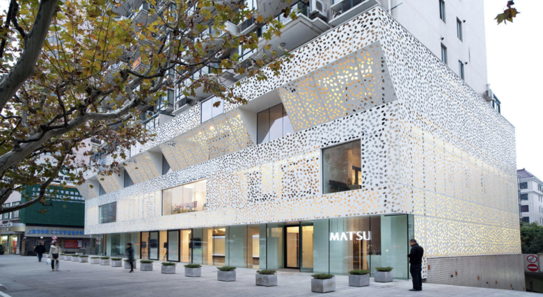 铭立家具旗舰店位于交通繁忙的肇嘉浜路路口,为隔音室外嘈杂的环境,我们希望营造“树荫下的家具店”。立面为银杏图案的镂空铝板,阳光透过,犹如身处一片银杏林中。而镂空出来的铝片也被浇注如混凝土地面上,营造落叶的浪漫。