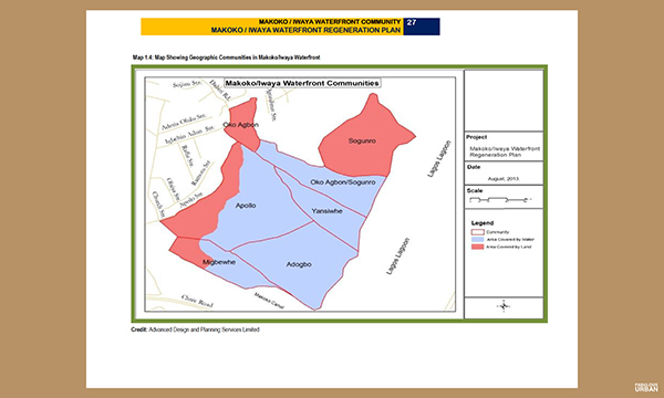 The Makoko/Iwaya Waterfront Regeneration Plan is a comprehensive neighborhood plan. It looks at all facet of life and development in Makoko/Iwaya Waterfront including land use, housing, tourism opportunities, economic development, tenure security, funding strategies and institutional framework for implementation and management. Apart from responding to the physical development issues on which Lagos State Government justified its intervention in July 2012, it addresses the economic and social dimensions, which have tremendous potentials for building the resilience of Lagos, increasing the livability index of the city and adaptation for implementation in other coastal communities in Lagos. The plan was presented to Lagos State Government (LASG) in February 2014.