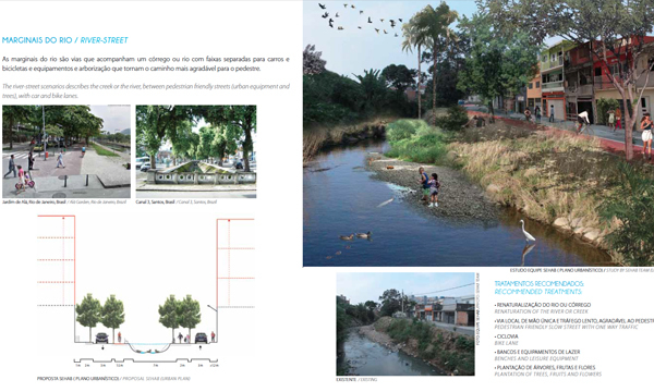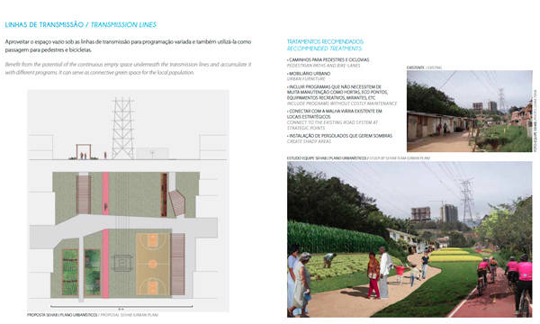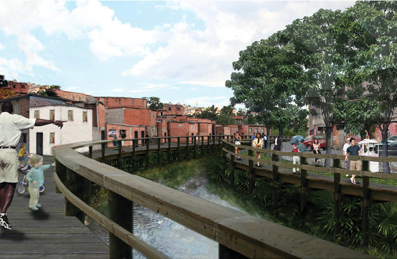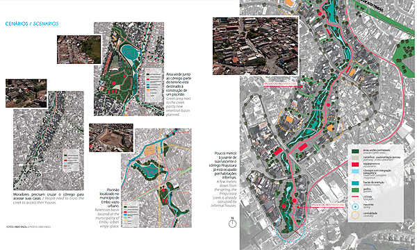 The Pirajussara creek emerges at the border between São Paulo and Embu, in the southwest of the metropolitan region with a total length of 19 kilometers. The creek defines at the same time the border between São Paulo and Taboão, another neighboring town of the metropolitan region with roughly 20 million inhabitants. The northeastern part of the Pirajussara basin is characterized by wealthy middle to upper middle class neighborhoods with well-equipped facilities, while the southwestern part is mainly defined by precarious settlements. Those concentrate especially along or on top of the creek along the arms of the latter. The area suffers from a serious lack of green and porous areas. The Pirajussara basin is home to roughly 1.2 million inhabitants. The southwester part, where most of the settlements are located, suffers furthermore from a serious lack in jobs and public transportation, which is obviously interrelated. This area is home to 420,000 people (or 119,795 families) but offers only 75,251 jobs. Only 17 percent of the people can therefore create an income in their immediate neighborhoods. 24 percent of the people commute daily long distances to their workplaces in São Paulo’s central parts. Impressive 59 percent of the people are unemployed. The urban plan suggests for the Pirajussara basin, and especially for the “forgotten part” of it, escaping from the classical problem-solution-approach. The urban planning strategy for the area recommends the implementation of the Pirajussara park, strongly linked to an ecological leisure network in order to create job opportunities for the local population. The proposed Pirajussara park connects with the large protected green areas in Embu, further to the west; with the subway final stop of the yellow line; with the newly implemented bike lane along the Pinheiros river, and to the Guarapiranga reservoir further to the south. The plan delivers a hands-on urban design tool box for the entire river, considering the current situations, and further a "density tool", promoting the densification on strategic locations.