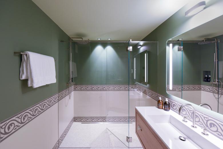 Das neue Raumkonzept des Hotels verbindet geschickt Tradition und Moderne. Inspiriert von der Entstehungszeit des Hotels werden die verwinkelten und kleinteiligen Einbauten der 80er Jahre zurückgebaut, um die Großzügigkeit der Räume wieder zur Geltung zu bringen. Ein besonderer Fokus liegt auf den Bädern, die entweder durch die Aufhebung eines Zimmers separiert werden oder bei den südlichen Zimmern entlang der Vorzone in der ursprünglichen Schichtung angeordnet sind. Diese Gestaltung verleiht den Räumen eine einladende Weitläufigkeit und schafft eine harmonische Atmosphäre für die Gäste.