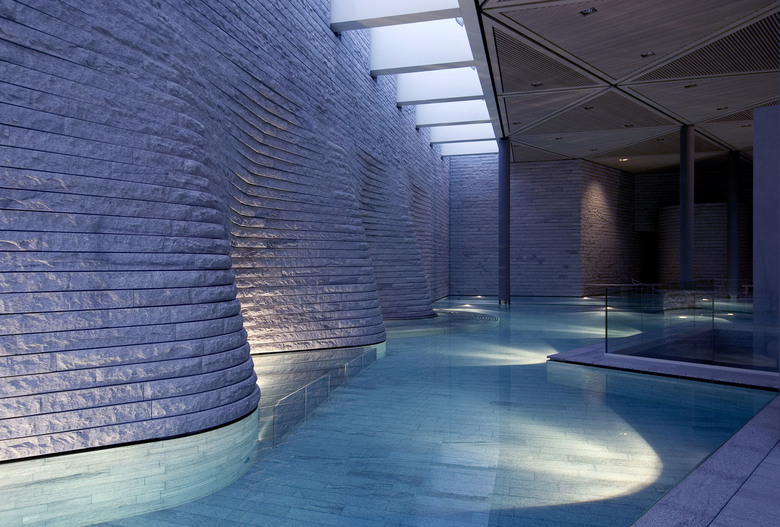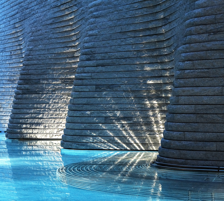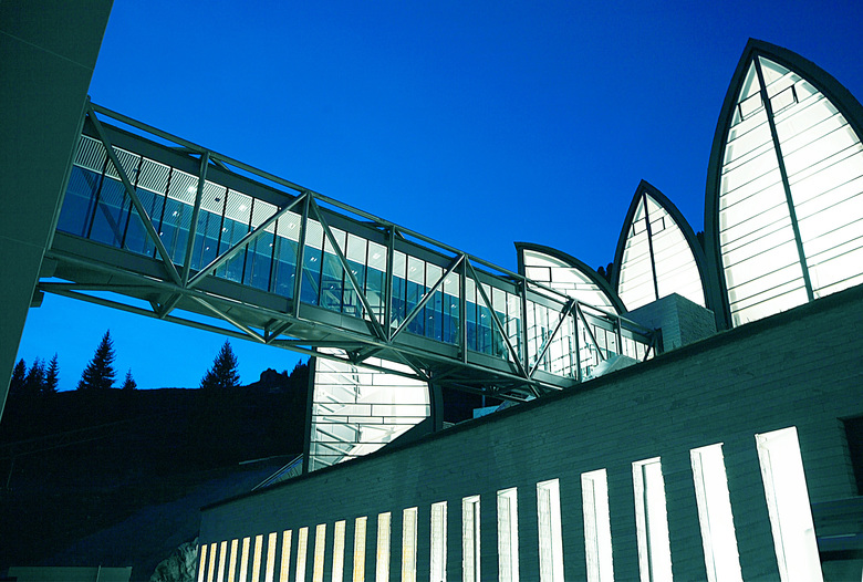Bauen ohne zu überbauen - während das grosse Volumen der funktionalen Räume im Berg verschwindet, zeugen emporragende Elemente (Blätter, Bäume - Oblichter mit einer eigenen Geometrie) von der Gegenwart des Neuen. Diese geometrisch– vegetalen Körper wecken die Neugier der Besucher: tagsüber „transportieren“ sie Licht in die unterirdischen Bereichen, während der Nacht hingegen leuchten sie über das Dorf hinaus.
