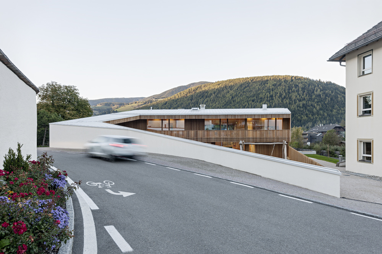 Innerhalb der gewachsenen Dorfstruktur Niederolangs in Südtirol erzählt das Haus des Kindergartens von dem Zusammenspiel zwischen Tradition, dem Zeitgenössischen und der Natur. Im beschaulichen Rahmen ordnet sich der dritte fertiggestellte Kindergarten von feld72 ein, ohne sich unterzuordnen. Selbstverständlich und ungezwungen. Sinnlich an seinem Ort verankert reagiert der Baukörper auf die bestimmende Präsenz der Pfarrkirche St. Petrus und Agnes mit Friedhofskapelle und der Grundschule in der Mitte Niederolangs. Wie in einer Schatulle sitzt der Holzbau in der umlaufenden, massiven Mauer und schenkt Geborgenheit.