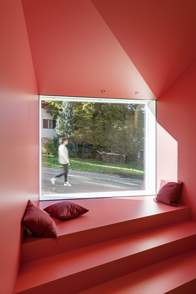 Die Mauer wechselt Materialität und Volumen, so wird sie vom Gartenzaun zur Grenzmauer zum Gebäude und zur Interpretation des Vorgefundenen als auch zum Weiterstricken des Bestandes. Die hofseitig komplett in Holz gehaltene Mauer umarmt in einer freundlichen Geste den Garten der Kinder. Überdachte, wettergeschützte Bereiche entstehen im Übergang zum Gebäude. Es entfaltet sich ein spielerischer Umgang mit dem Element der Mauer. Architektur und Spielplatz verschmelzen. Das traditionelle Element der Umzäunung gewinnt an Komplexität und Aufenthaltsqualität – es beherbergt, rahmt, versteckt, lädt zum Spielen ein und schenkt Ein- sowie Ausblicke. Das Gebäude selbst bleibt dabei klar und wirkt dennoch vielschichtig.