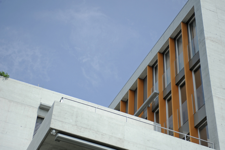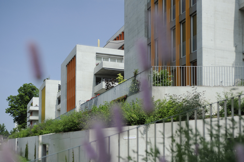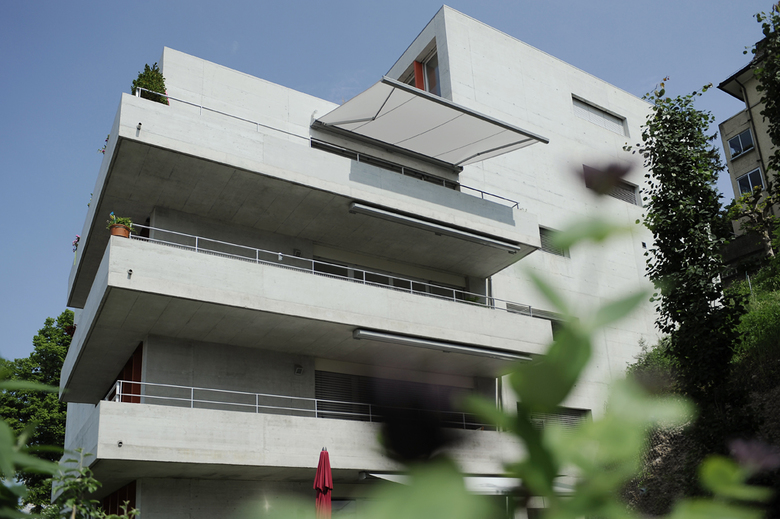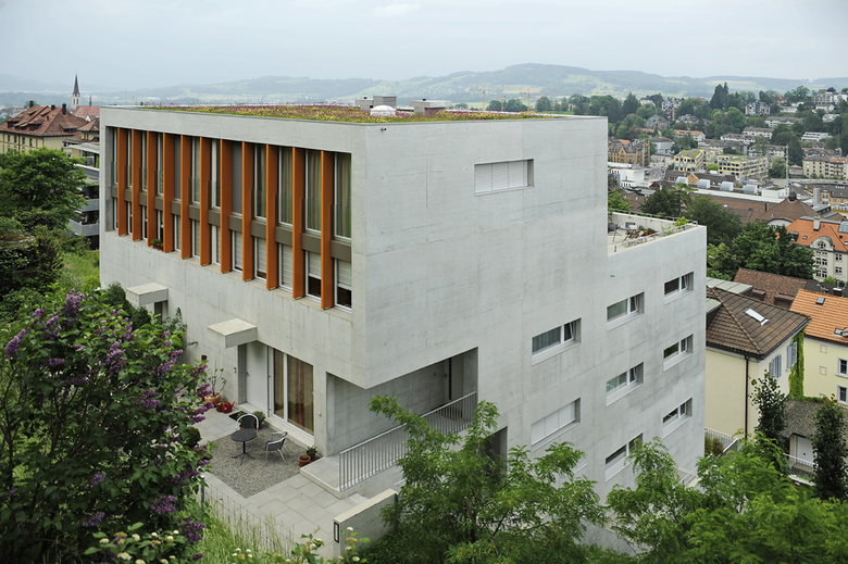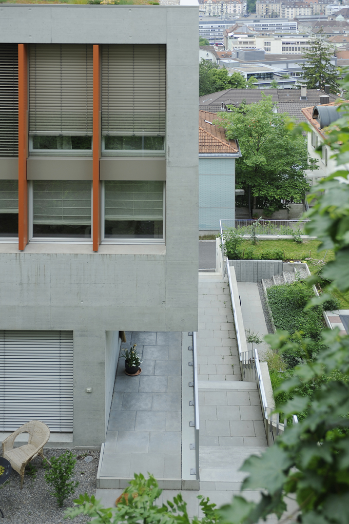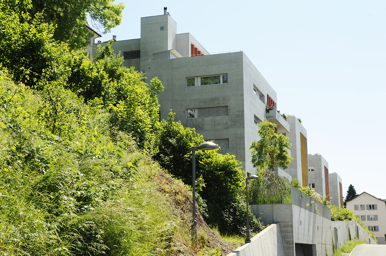 Vier Wohnhäuser mit je fünf Wohnungen sind an prominenter Lage im Zentrum der Stadt entstanden. Die kompakten, plastisch wirkenden Gebäude fügen sich in ihrer Masstäblichkeit in die angrenzenden Bebauungsmuster ein. Dank ihrer Höhenlage überragen sie die talseitige Häuserzeile deutlich und werden damit als markante Gebäudegruppe wahrgenommen. Die Häuser sind in Sichtbeton ausgeführt. Geschlossene seitliche Fassadenflächen wechseln mit grossen Fensterflächen zur Talseite. Diese sind mit farbigen vertikalen Holzlamellen differenziert gestaltet. Alle Wohnungen sind direkt von der Einstellhalle aus über Lift erschlossen. Grundriss und Ausbau der Wohnungen wurde individuellen Wünschen angepasst. Sämtliche Wohnungen verfügen über attraktive Aussenbereiche. Die Gärten über der Tiefgarage sind den Erdgeschosswohnungen zugeordnet, die beiden darüber liegenden Geschosswohnungen verfügen über grosse Balkone. Die oberen Maisonette-Wohnungen sind mit grosszügigen Terrassen ausgestattet.