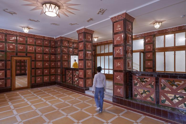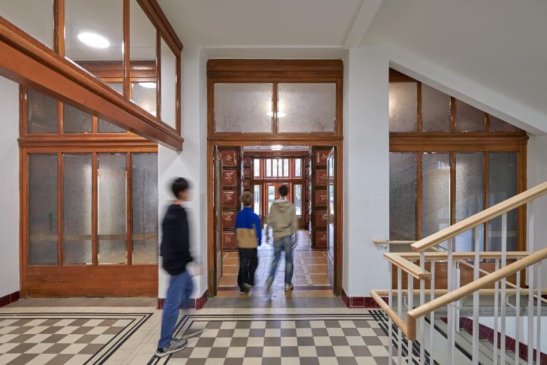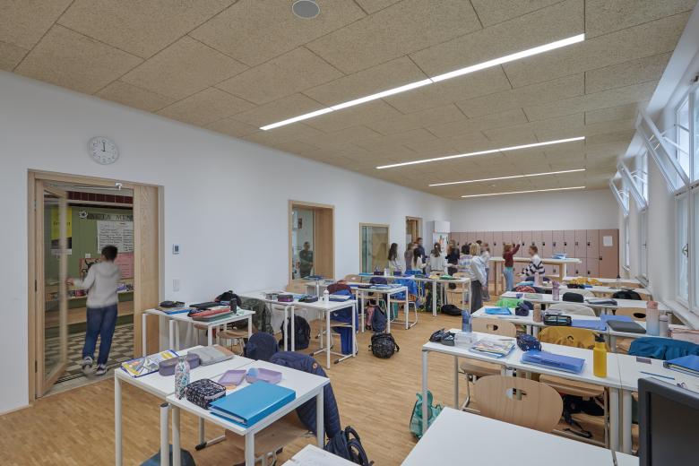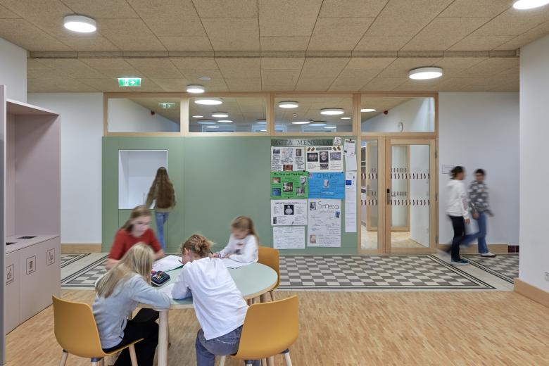 Die Adaptierung des Gebäudes innerhalb der Denkmalschutzvorgaben bot die Chance, Schulbaunormen zu hinterfragen und davon teilweise abzuweichen. So ergeben sich bei der vorhandenen Trakttiefe von 5 Metern Klassenzimmer, die schmäler, aber auch länger sind als üblich. Das bietet Platz für individuelles Lernen, Gruppenarbeiten und eine Garderobe. Wir entfernten Zwischenwände und öffneten die dunklen Mittelgänge zu den Unterrichtsräumen. Zwischen den Klassen entstanden offene Pausen- und Lernzonen. In den Gängen blieben die charakteristischen roten Fliesen der Sockelleisten und Türrahmen teilweise im Original erhalten – im gesamten Gebäude zitieren wir diese vorhandenen Elemente in den architektonischen Ergänzungen.