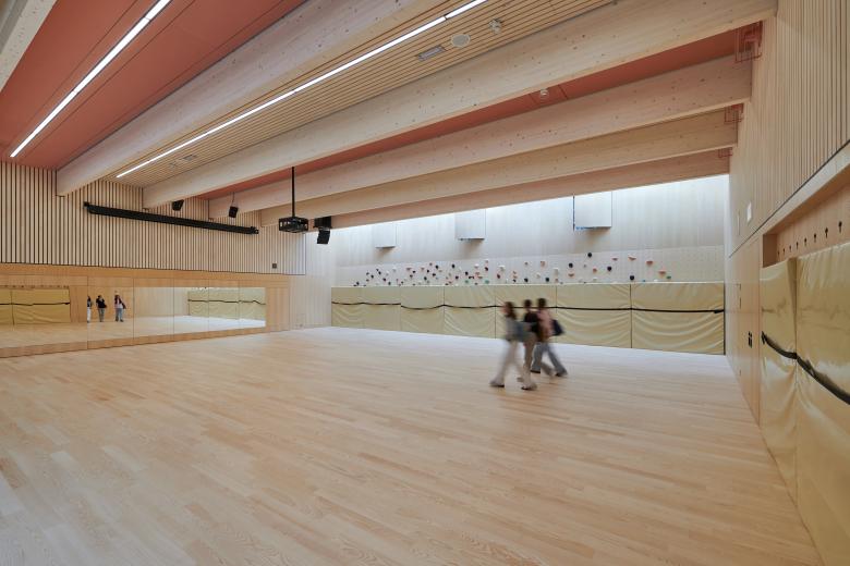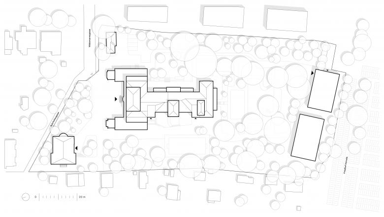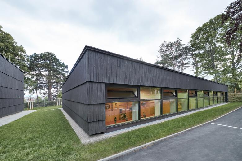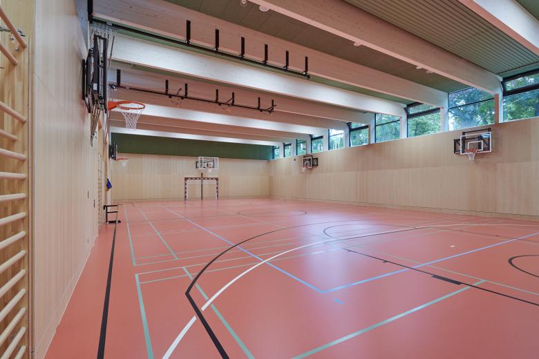 Für den Turnunterricht ergänzten wir im Süden des Schulparks zwei Sportpavillons in Holzriegelbauweise. Der größere Turnsaal ist als Normturnhalle für Ballsportarten konzipiert, der kleinere wird als Bewegungshalle mit Boulder- und Spiegelwand genutzt. Mit den schwarz lasierten, geschuppten Holzlamellen stehen die beiden Turnsäle als Skulpturen wie selbstverständlich im Park zwischen den alten Bäumen als zeitgemäße architektonische Ergänzung zum altehrwürdigen Bestand.