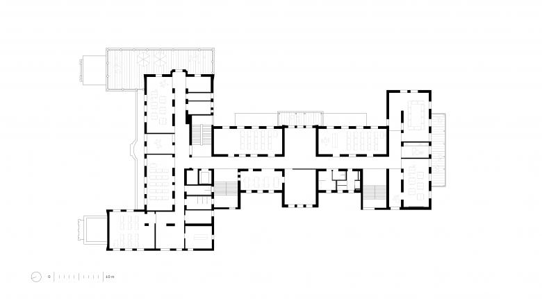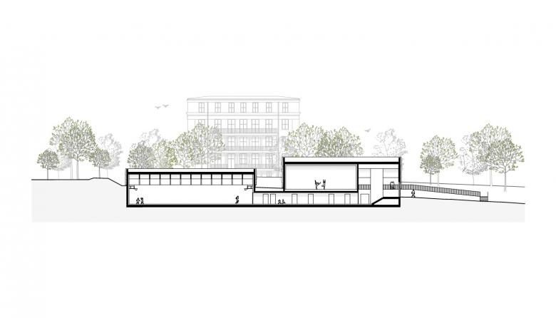 Zum Park senkten wir das Gelände ab. Aus dem dunklen Keller wurde ein helles Gartengeschoß mit ebenerdigem Zugang für Cafeteria und Nachmittagsbetreuung. Das ehemalige Verwaltungsgebäude gegenüber dem Hauptbau erhielt eine neue Funktion als Haus der Naturwissenschaften mit Laborräumen.