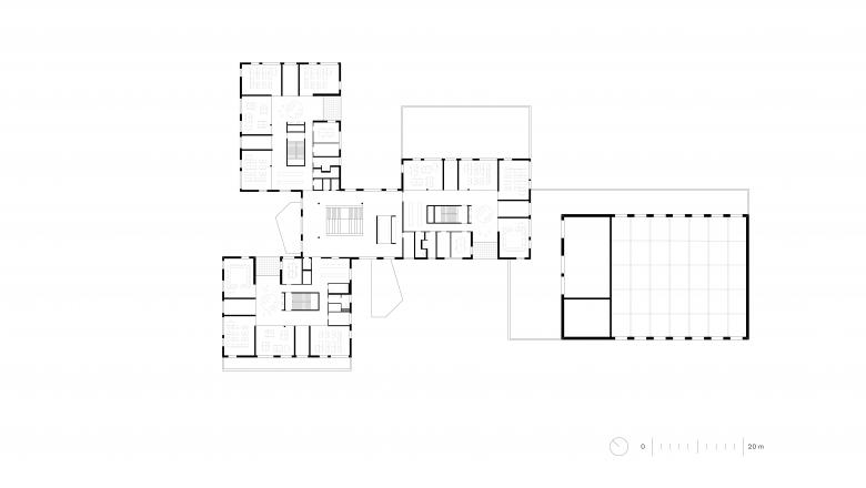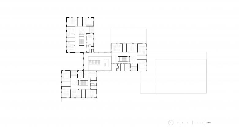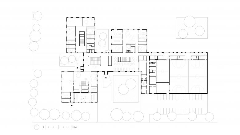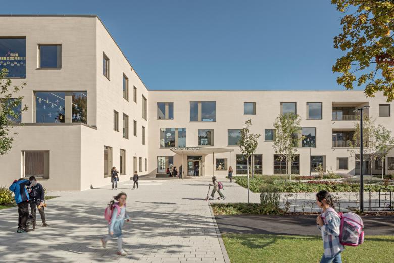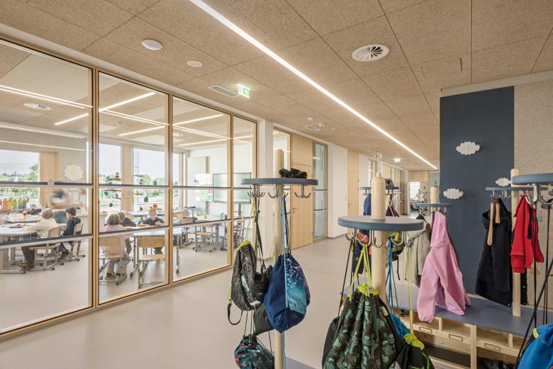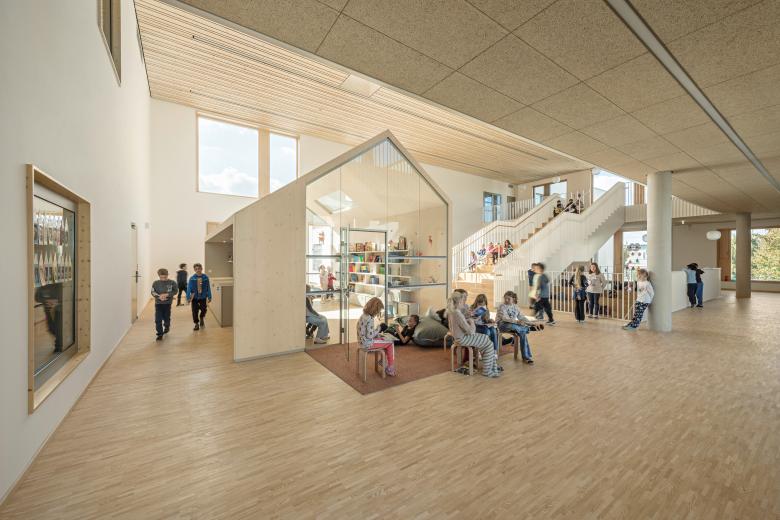 Jeweils vier Klassen bilden zusammen einen Cluster – eine kleine, abgeschlossene Einheit, in Anlehnung an die Dorfschulen der Umgebung. Insgesamt fünf solcher Dörfer gibt es in der Schule. Diese teilen sich jeweils Garderobe, Arbeitsküche mit Platz für den gemeinsamen Schulalltag und eine Loggia. Hell und transparent bilden sie eine vertraute Einheit für 100 Kinder.
