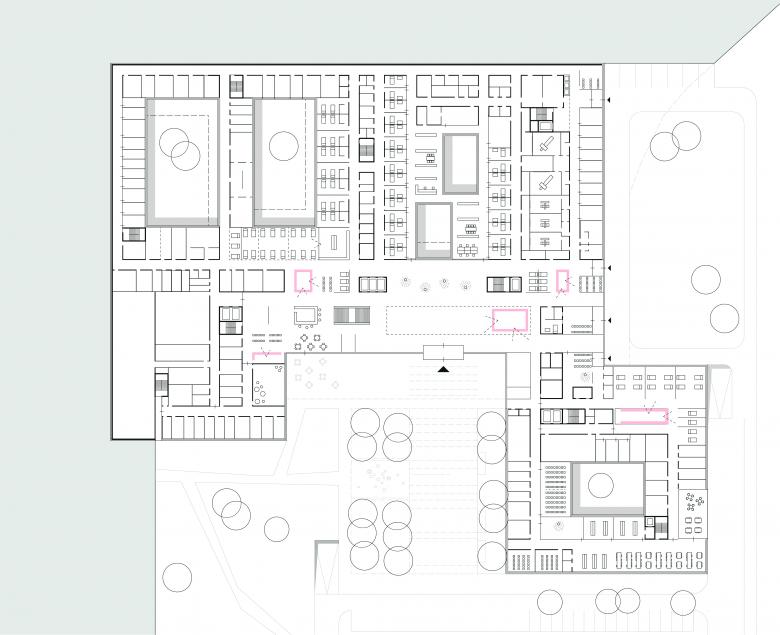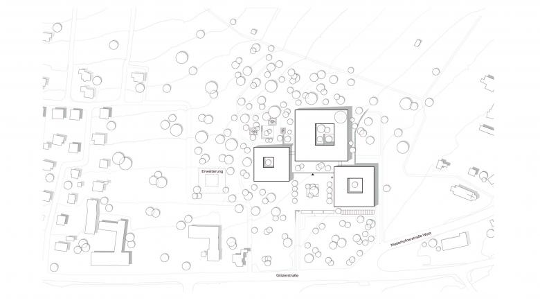 Im Einklang mit der Natur – Das große Grundstück nutzen wir für einen naturnah angelegten Landschaftspark. Die Grünflächen umspülen regelrecht die Baukörper von allen Seiten und sind bis in die von den Gebäuden umschlossenen Themenhöfe spürbar. Im Eingangsbereich schaffen Sitz- und Verweilbereiche Treffpunkte auch außerhalb des Krankenhauses. An die Pflege-Geriatrie angeschlossen entsteht ein abwechslungsreicher Therapie- und Demenzgarten, der restliche Landschaftspark ist als Erholungs-, Aktiv- und Spielelandschaft für alle Generationen konzipiert. Auf diese Weise entsteht in Liezen ein naturnahes Leitspital, das die lokale Bevölkerung in allen Lebenslagen – von der Entbindungsstation über Kinderambulanz und Intensivmedizin bis zu Spezialmedizin für ältere Menschen– begleiten und unterstützen wird.