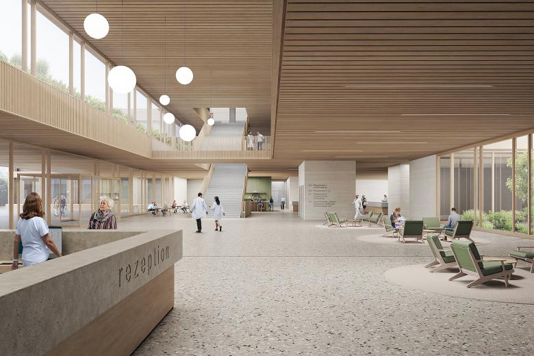 Das ist auch unser Anspruch an die Pflegezimmer: In allen haben die PatientInnen Ausblick ins Grüne und somit einen direkten Zugang zum Freiraum, der bei der Heilung unterstützt. Wenn ein neues Spital in so einer Umgebung entsteht, ist es unumgänglich, auch die Lage maximal zu nutzen und die Landschaft bewusst ins Gebäude zu ziehen. Auch der Werkstoff Holz in den PatientInnenzimmern ist ein Bestandteil des Genesungsprozesses, da dieser nachweislich eine beruhigende Wirkung auf das Herz-Kreislauf-System hat.