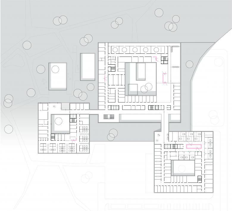 Ein Krankenhaus, drei Häuser – Um den dörflichen Charakter zu bewahren, setzen wir drei unterschiedlich große Baukörper versetzt in die sanft ansteigende Landschaft. Mit dieser möglichst kleinteiligen Struktur und dem Zunutzemachen der Topografie schaffen wir es, alle funktionalen Anforderungen des Krankenhauses in nur drei wahrnehmbaren Geschoßen unterzubringen und gleichzeitig für maximale Belichtung zu sorgen. Gemeinsam bilden die drei Gebäude auch den Vorplatz – das vorgezogene, begrünte Dach der Sockelzone sorgt für einen witterungsgeschützten Haupteingang. Das Besondere: Durch getrennte und jeweils eigene Zufahrten für Rettungswägen, Besucher-PKWs und Anlieferungen bleibt der Vorplatz autofrei.