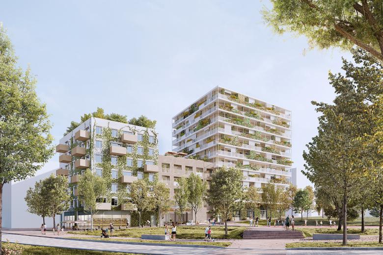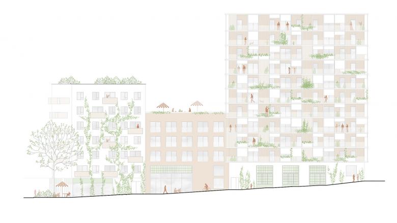 Die Kleinteiligkeit spiegelt sich nicht nur im Erd- und Regelgeschoß wider – auch auf den Dächern der drei Gebäude herrscht Unterschiedlichkeit. Ein gemeinschaftlicher Dachgarten mit Urban Gardening sorgt fürs Gemeinschaftsgefühl, eine Stadtwildnis für Abkühlung und die Fotovoltaik-Anlage mit Grünfläche für Energie. Die zusätzliche Fassadenbegrünung, die Bauteilaktivierung und ein Free-Cooling-System runden das umfassende Klimaresilienz-Paket ab.