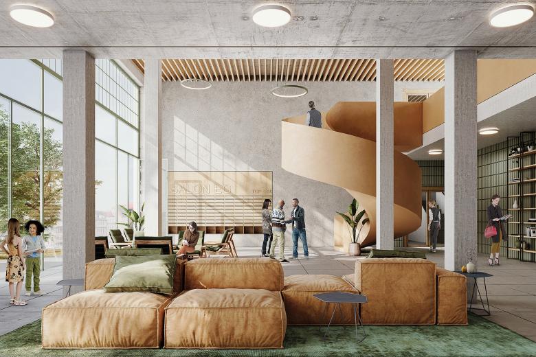 Als Herzstück und gemeinsamer Eingangsbereich der drei Gebäude dient der Salon im mittleren Gebäudeteil B. Hier im Entrée treffen sich die BewohnerInnen und Gewerbetreibenden, spazieren über die offene Wendeltreppe in den Innenhof, tauschen sich aus. Der Salon ist kein dunkles Stiegenhaus, sondern ein Ort des Miteinanders, ein gemeinsames Wohnzimmer mit Lernbereich, Bibliothek und Spielraum.