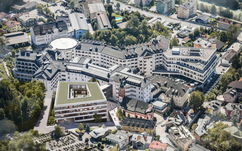 Es ist das Herzstück des Kardinal Schwarzenberg Klinikums, an dem wir im laufenden Betrieb laborieren werden. In den kommenden Jahren entsteht auf einem topografisch schwierigen Gelände ein passgenauer Neubau, der auf einzigartige Weise Therapie und Diagnostik verbindet. Auf sieben Ebenen bietet der kompakte Zubau etwa Platz für Operationssäle, Intensivstation, Apotheke, Pathologie und eine Psychiatrie. Diese befindet sich in den obersten beiden Geschoßen und öffnet sich zu einem lichtdurchfluteten Therapiegarten – eine Ruheoase mit Blick auf Himmel und Gebirgszüge.