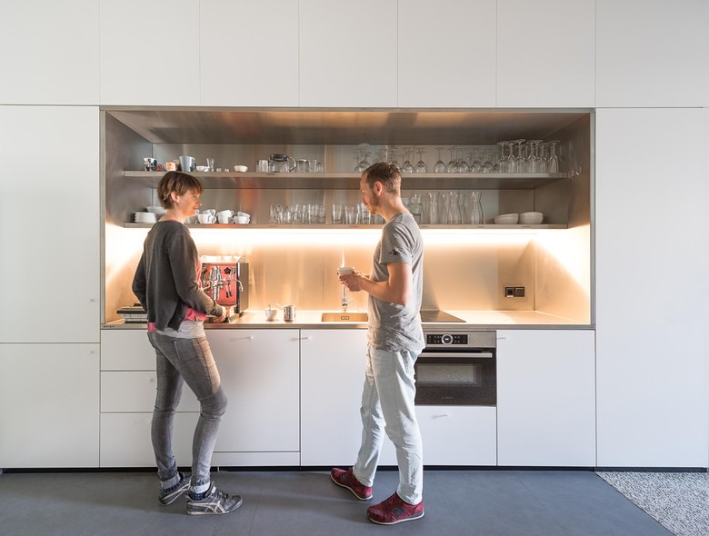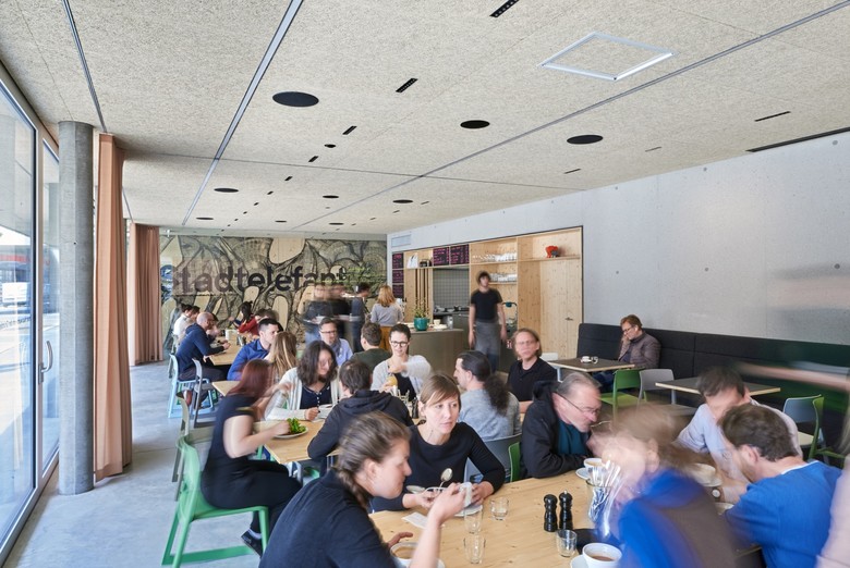 Im Stadtelefant haben wir uns dafür 100 m² im Erdgeschoss freigehalten. Das öffentliche Lokal wird von Barbara Chira (Mittagstisch) und Tobias Radinger (das phil, kaffeeküche) betrieben und tagsüber auch als hauseigene Kantine genutzt. Dieser Gemeinschaftsort funktioniert als Raum für Diskussionen, informelle Meetings oder Events und lädt BewohnerInnen, Angestellte des Grätzls und bei Veranstaltungen auch die Wiener Architekturszene ein, „bei uns“ Gast zu sein und einzukehren.