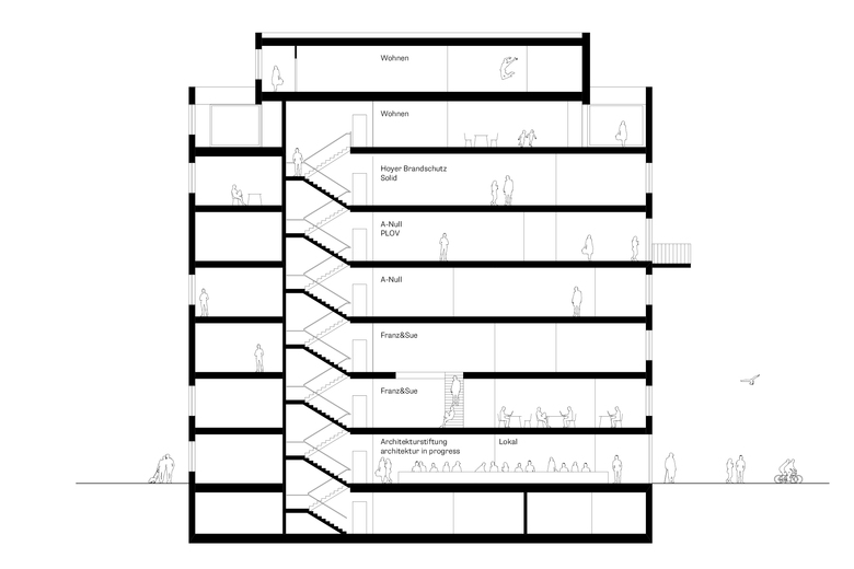Die Architekturstiftung Österreich und der Verein architektur in progress arbeiten als Mieter im Co-Working space. Mit einem gemeinsamen Programm beleben wir das Erdgeschoss. Im sechsten Stockwerk findet man das neue Büro von Statik Petz.