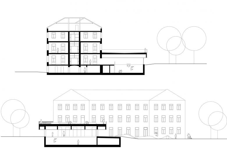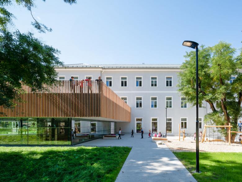 Wir haben die erhaltenswerte Bausubstanz saniert, einen Teil abgerissen und in die entstehende Lücke einen neuen Klassentrakt gestellt. Unser Zubau im Schulhof beherbergt eine versenkte Turnhalle, die neue Aula und am Dach oben drauf für die Pausen eine großzügige Terrasse. Der Haupteingang befindet sich in der verglasten Aula, die dem Neubau den Anschein eines schwebenden Körpers im Park gibt.