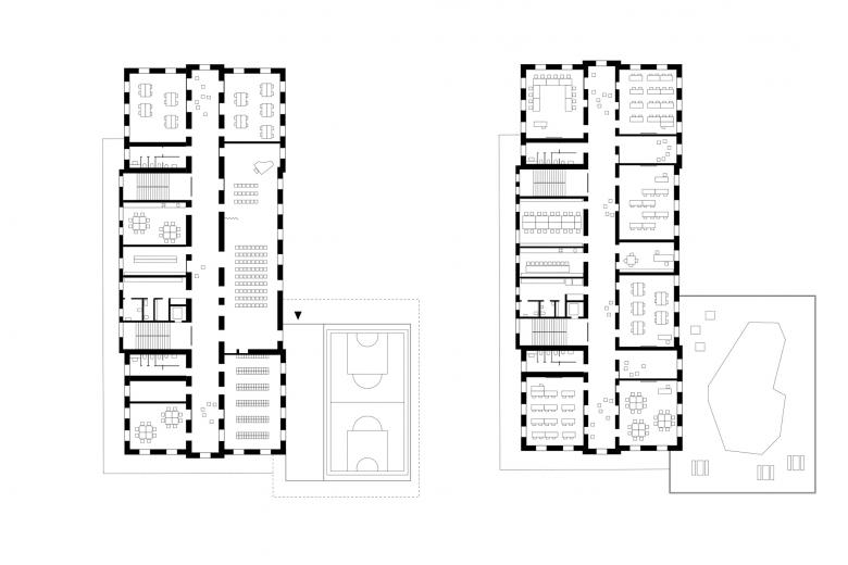 Weiterbauen – Die beiden Obergeschoße der Schule konnten wir relativ einfach für die gewünschten offenen Lernlandschaften adaptieren. Die Lernzonen sind jeweils an den Gebäudeecken positioniert. Hier werden sie von zwei Seiten belichtet. Die bestehenden Wände haben wir teilweise aufgebrochen und stattdessen mobile Raumteiler eingesetzt – nun können die danebenliegenden Klassenräume nach Bedarf weg- und dazugeschaltet werden.