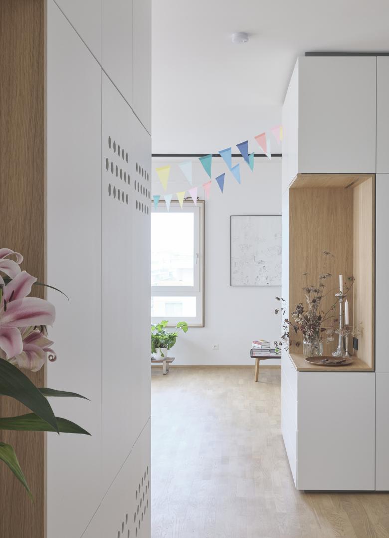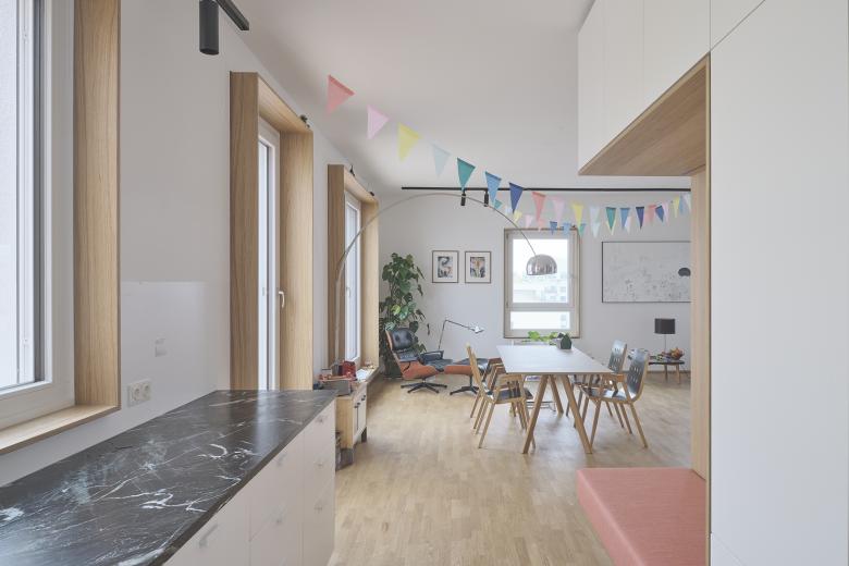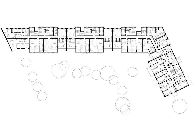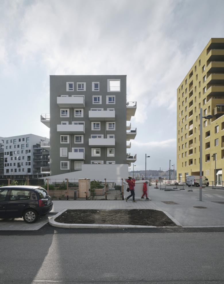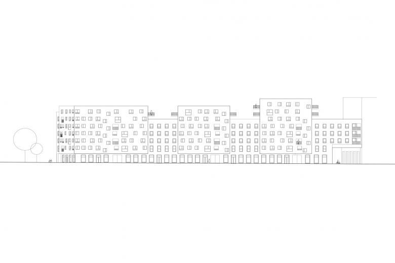 Kleinteilig – Die Bruno Marek Allee ist wie es sich für einen Boulevard gehört ordentlich lange und zu beiden Seiten mit Bäumen gesäumt. Damit die Straße nicht eintönig wird, haben wir daher statt einer langen Wohnzeile eine Vielzahl an vertikalen Häusern mit unterschiedlichen Gebäudehöhen geplant. Die unterschiedliche Höhe der Gebäude ermöglicht gut nutzbare Dachgärten. Das Haus mit den Eigentumwohnungen erhält üppige in den Stadtraum ragende Balkone und am Dach großzügige, geschützte Atrien.